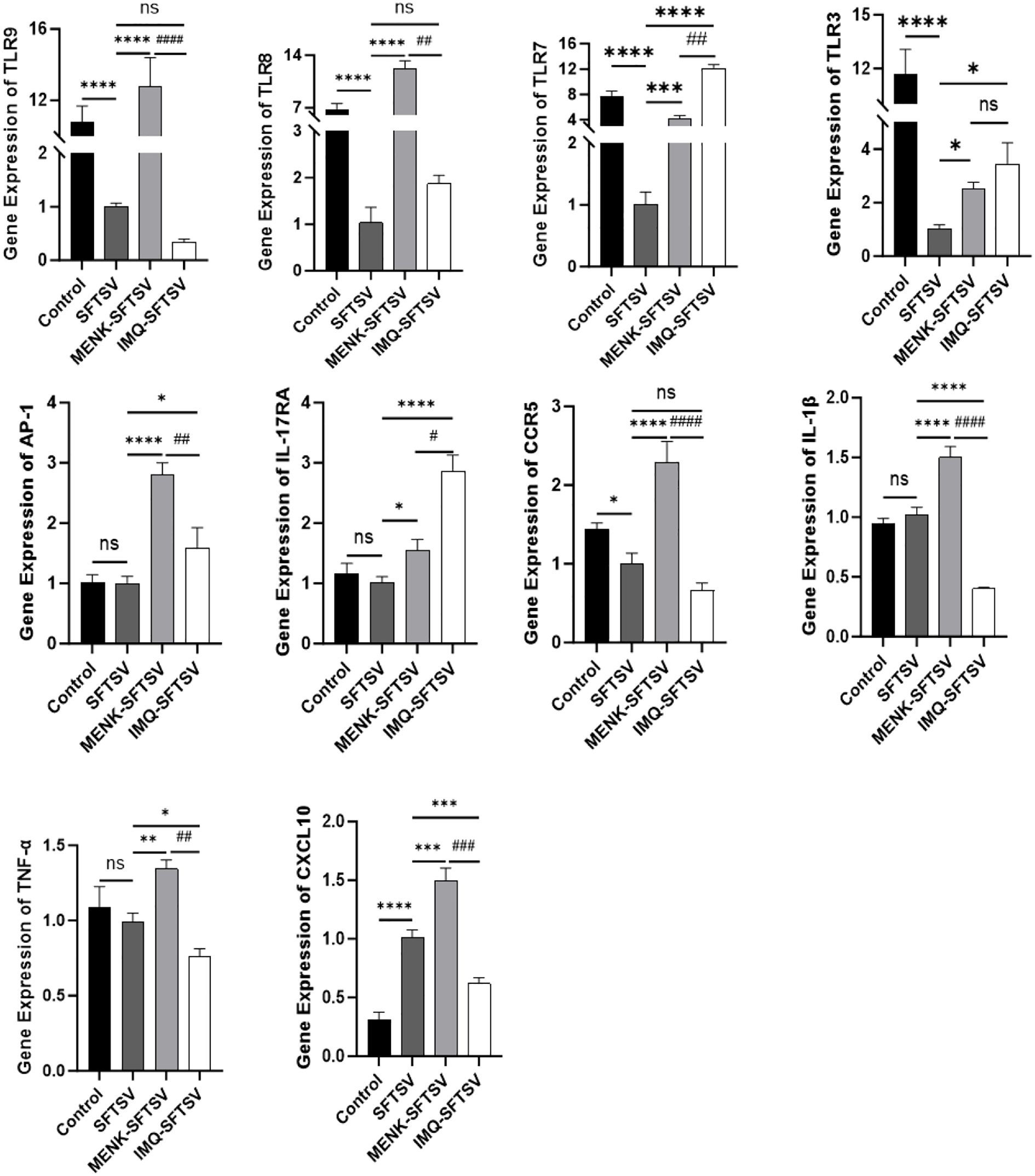 Figure 13. Effects of MENK and IMQ treatment on the antiviral state of RAW264.7 cells. Detection of the expression levels of TLR9, TLR8, TLR7, TLR3, AP-1, IL-17RA, CCR5, IL-1β, TNF-α, and CXCL10 in the Control, SFTSV, MENK–SFTSV, and IMQ–SFTSV groups by qPCR. Comparisons between the Control group and SFTSV group, SFTSV group and MENK-SFTSV group, as well as SFTSV group and IMQ-SFTSV group, *P < 0.05, **P < 0.01, ***P < 0.001, ****P < 0.0001. MENK-SFTSV vs. IMQ-SFTSV group, #P < 0.05. ##P < 0.01, ###P < 0.001, ####P < 0.0001.
