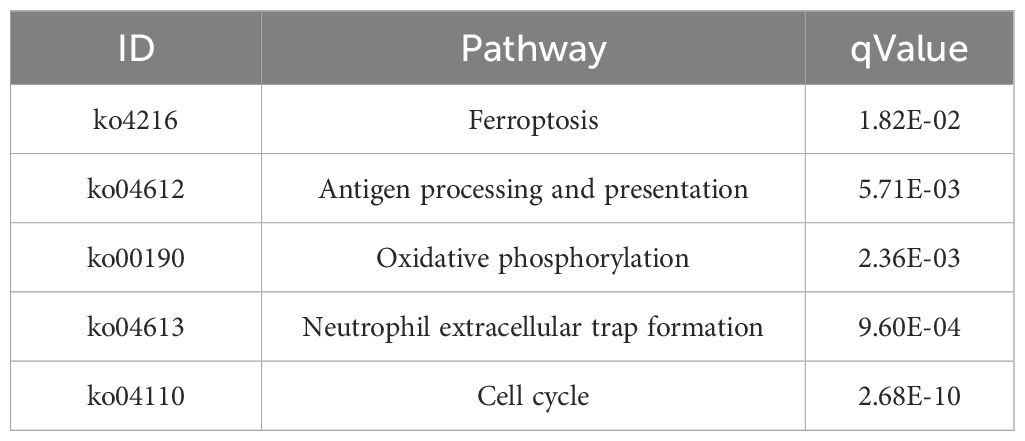 We performed KEGG enrichment analysis to annotate DEGs in metabolic pathways, thus providing insights into the effect of gene expression changes on biological processes. This analysis elucidated the functional roles of DEGs in various metabolic pathways. The KEGG pathway enrichment analysis of the SFTSV and Control groups revealed significant involvement in ferroptosis (ko04216), antigen processing and presentation (ko04612), oxidative phosphorylation (ko00190), neutrophil extracellular trap formation (ko04613), and cell cycle (ko04110) (Figures 8A, B; Table 3). In the ko04613 pathway, FcγRI and FcγRIV were upregulated, suggesting that macrophages recognize viral particles through surface Fc receptors for subsequent clearance following SFTSV infection. Conversely, TLR2, TLR4, TLR7, and TLR8 were downregulated, indicating that SFTSV may suppress TLR signaling to evade immune responses (Supplementary Figure S2).