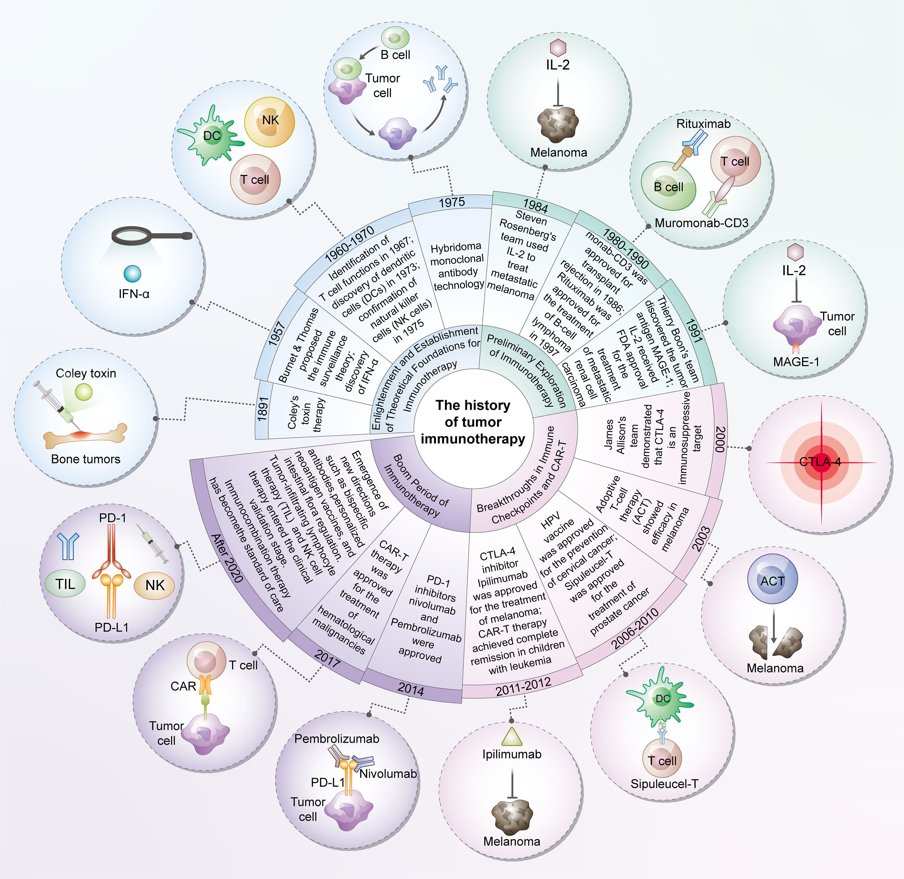 Figure 1. The history of tumor immunotherapy. The development of tumor immunotherapy represents a transformative history spanning from theoretical inception to clinical innovation. Originating initially from the establishment of fundamental theories such as immune surveillance, this field has gradually undergone exploratory phases including cytokine therapy and monoclonal antibody-based approaches, ultimately achieving major breakthroughs in immune checkpoint inhibitors and chimeric antigen receptor T-cell (CAR-T) therapy—breakthroughs that have revolutionized the treatment paradigm for multiple cancer types. In recent years, immunotherapy has entered a new era characterized by diversification and combined applications. Emerging directions such as personalized vaccines, bispecific antibodies, and microbial modulation continue to emerge, while immunotherapeutic combination strategies have become standard protocols in tumor treatment. Overall, tumor immunotherapy not only exemplifies the successful translation of basic scientific research into clinical practice but also demonstrates a distinct trend from the exploration of single mechanisms toward multi-targeted, personalized integrated therapy.
