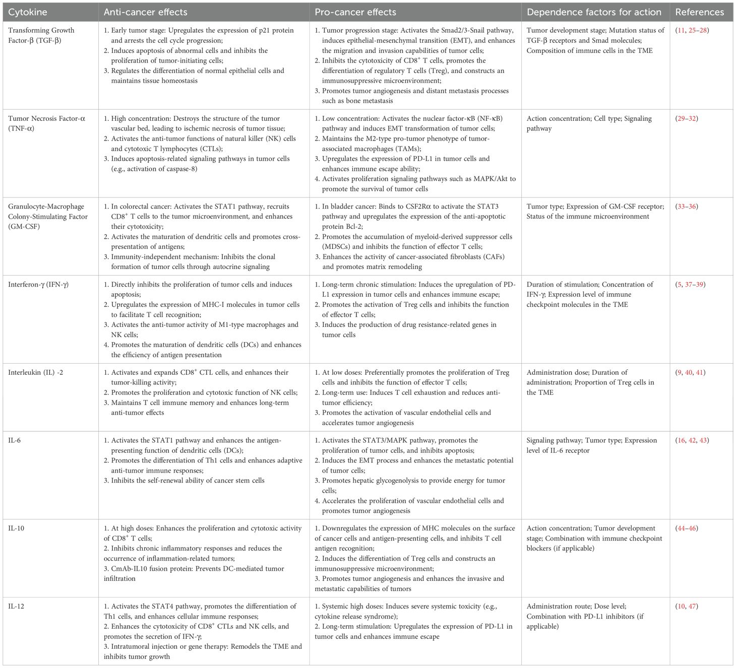 Beneath the dual effects of cytokines lies a dynamic balance of multiple regulatory factors. Table 1 presents the roles of cytokines that exert dual effects in tumors, as well as the factors dependent on these roles. The concentration effect is one of the most prominent regulatory mechanisms: the unique and opposing roles of TNF-α in cancer depend on the cytokine concentration (29); IL-2 can enhance T cell function at appropriate levels but may induce T cell exhaustion when excessive (9). Specifically, low concentrations of TNF-α activate the NF-κB signaling pathway, inducing EMT in tumor cells, enhancing their invasiveness, and sustaining tumor-associated macrophages (30). In contrast, high-dose recombinant human TNF-α can induce hemorrhagic necrosis in syngeneic transplanted tumors in mouse models and human tumor xenografts (31). The core mechanism underlying this effect is the disruption of the tumor vascular bed, resulting in ischemic necrosis of tumor tissue (29, 31).