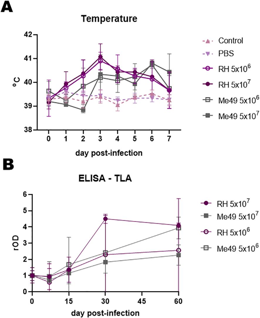 Figure 1. Clinical and humoral response after experimental infection of lambs with different doses (5 × 106 and 5 × 107) and strains (RH and Me49) of Toxoplasma gondii. (A) Rectal temperature in experimentally infected and uninfected controls. (B) Humoral responses were evaluated by IgG-ELISA against total lysate antigen (TLA) over the course of infection. Optical density (OD) values were normalized to day 0 readings and expressed as relative OD (rOD).