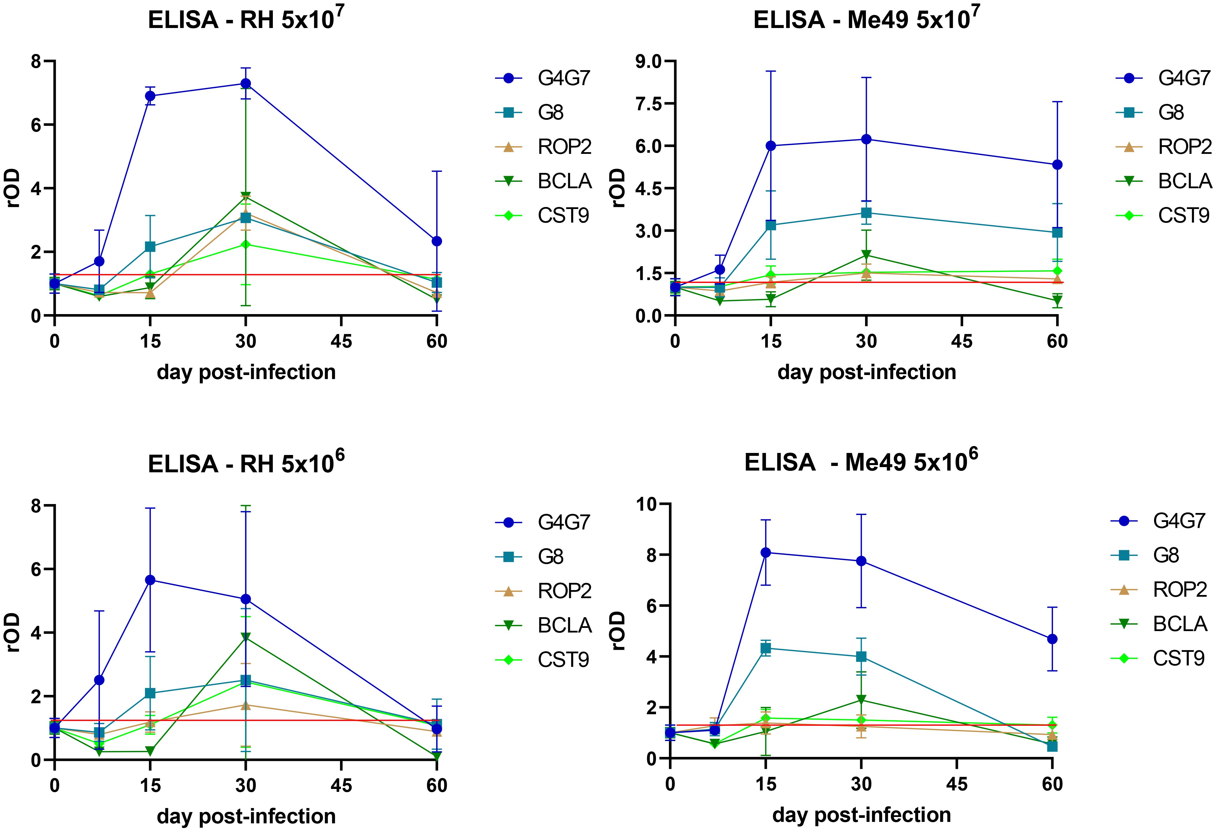 Figure 2. Profile of the humoral response against individual antigens. IgG reactivity to rGra4Gra7, rGra8, rROP2, rBCLA, and rCST9 was assessed by ELISA throughout the course of infection. Optical density (OD) values were normalized to the corresponding day 0 readings and expressed as relative OD (rOD). The red line represents the mean OD at day 0 plus one standard deviation.