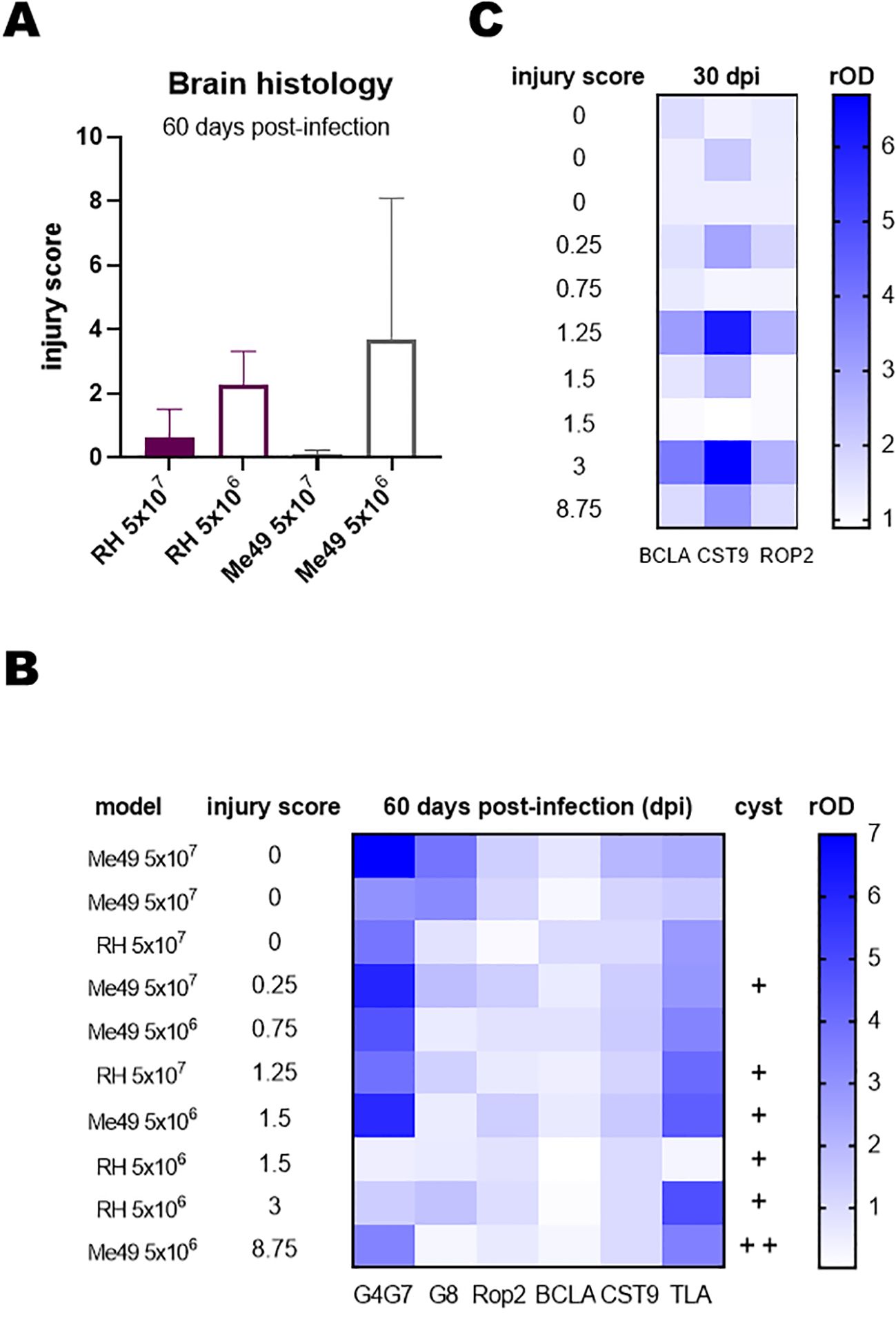 Figure 3. Histopathological analysis of infected lambs. Brain regions were examined by hematoxylin and eosin staining to assess lesions and inflammatory processes. Lesions were scored on a scale from 0 to 3, with 0 indicating no lesions and 3 indicating severe lesions. Scoring was performed independently by two observers. Eight brain samples were analyzed per lamb, covering comparable brain areas across all animals. (A) Total injury score per lamb, calculated by summing the average scores obtained by both observers for the eight samples. (B) Heat map of relative OD (rOD) values for each serum against the indicated rAGs at day 60 post-infection. Lambs were ranked according to their total injury score. +, indicates the presence of 1 cyst in 300 µl of brain sample or in all 8 samples of the histopathological study. (C) Heat map of rOD values for each serum against rBCLA, rCST9, and rROP2 at day 30 post-infection. Lambs were ranked according to their total injury score.