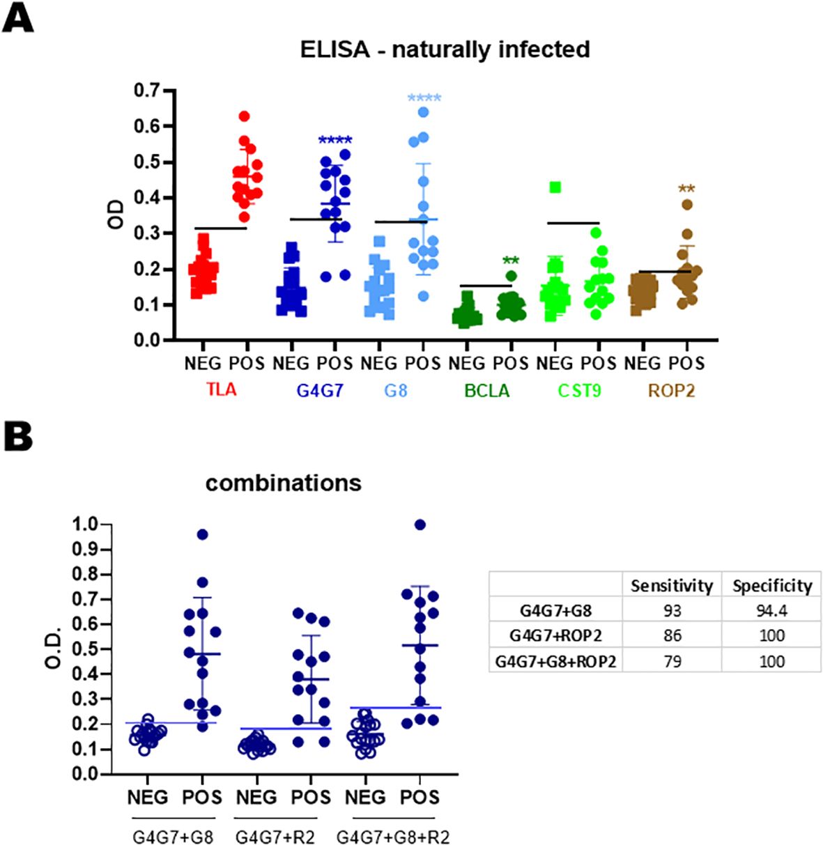 Figure 4. Humoral response of naturally infected sheep. (A) Sera from seronegative (n = 18) and seropositive (n = 14) sheep were analyzed by IgG-ELISA against individual rAGs. OD values are shown, with each point representing a single serum. Mean ± SD values for each rAG are indicated. The horizontal line denotes the cut-off for each antigen, defined as the mean OD of seronegative sera plus 3 SDs. (B) Combinations of rAGs were analyzed by IgG-ELISA. Sensitivity and specificity values are summarized in the table. Statistical significance: **p < 0.01; ****p < 0.0001.