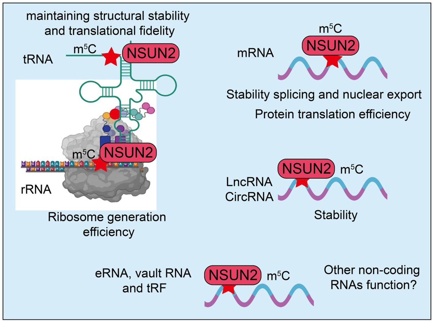 Figure 1. Regulatory roles of NSUN2-mediated m5C modification across different RNA types. NSUN2 exerts predominantly positive regulatory effects on RNA metabolism. In tRNAs, NSUN2-catalyzed m5C modification maintains structural stability and promotes translational fidelity. In rRNAs, NSUN2 enhances ribosome biogenesis and translational efficiency. For mRNAs, NSUN2-mediated methylation increases RNA stability, facilitates splicing and nuclear export, and promotes protein translation. Similarly, NSUN2-induced m5C modification on long non-coding RNAs (lncRNAs) and circular RNAs (circRNAs) enhances transcript stability. NSUN2 may also positively regulate the function and stability of other non-coding RNAs, such as enhancer RNAs (eRNAs), vault RNAs, and tRNA-derived fragments (tRFs). Collectively, NSUN2 acts as a positive post-transcriptional regulator that promotes RNA stability and translation across diverse RNA species.