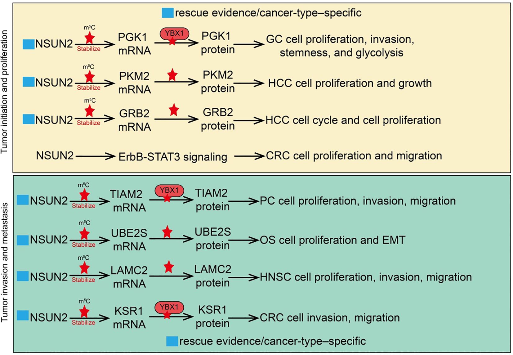Figure 2. Roles and mechanisms of RNA m5C modification mediated by NSUN2 in tumor progression and metastasis. The blue box indicates that the article includes rescue experiments showing that restoration of certain NSUN2 target genes can only partially rescue the phenotypes caused by NSUN2 loss, and that such effects are restricted to specific cancer types. However, this was not explicitly labeled in the manuscript, which may give the impression that no rescue experiments were performed.
