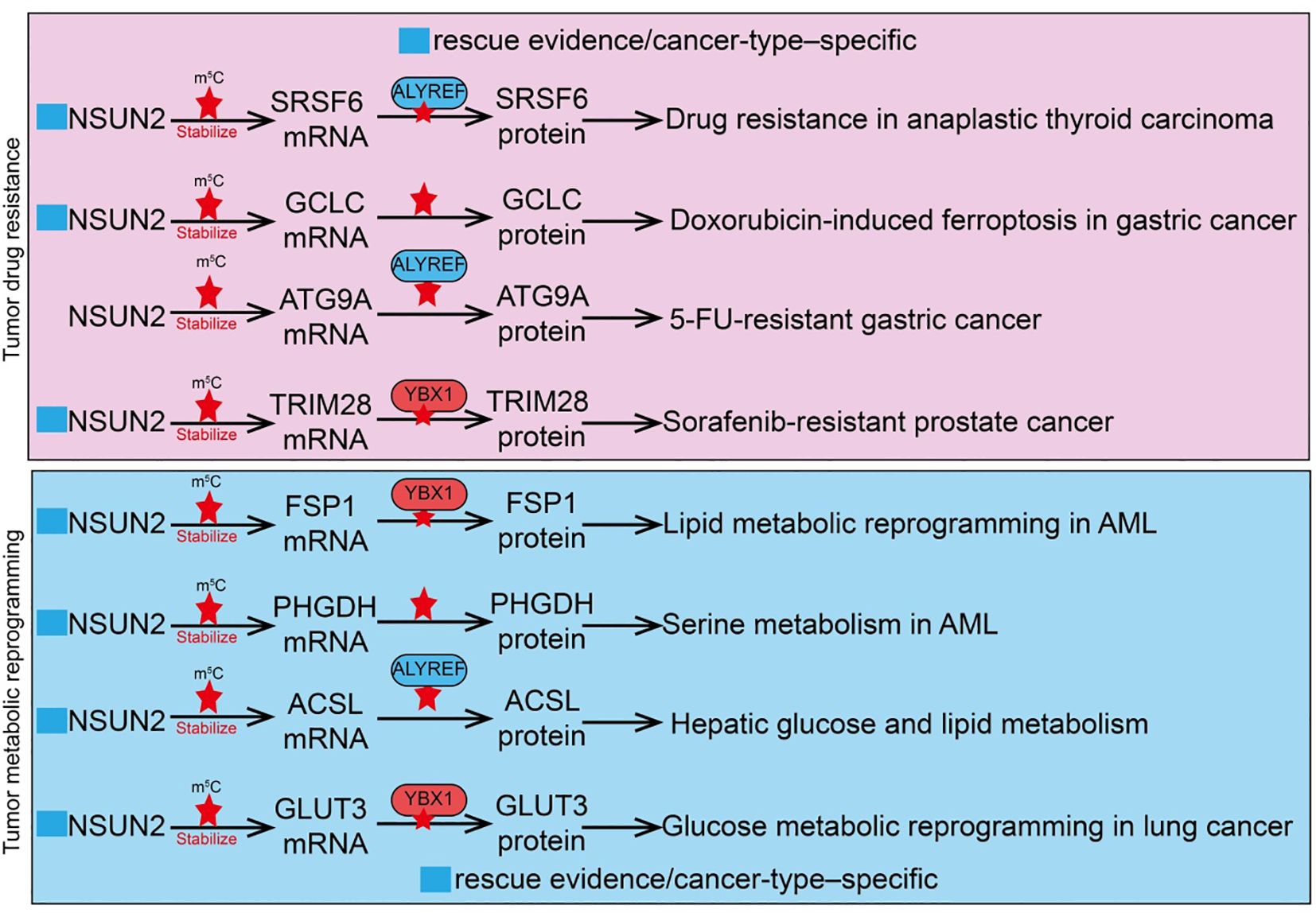 Figure 3. Roles and mechanisms of RNA m5C modification mediated by NSUN2 in tumor drug resistance and metabolic reprogramming. The blue box indicates that the article includes rescue experiments showing that restoration of certain NSUN2 target genes can only partially rescue the phenotypes caused by NSUN2 loss, and that such effects are restricted to specific cancer types. However, this was not explicitly labeled in the manuscript, which may give the impression that no rescue experiments were performed.