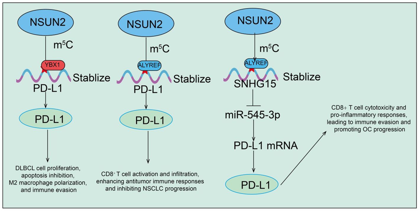 Recent studies increasingly indicate that the tumor immune microenvironment (TIME) plays a critical role in cancer initiation, progression, and therapeutic response. As an RNA m5C methyltransferase, NSUN2 not only regulates intrinsic tumor cell proliferation and metabolism but also significantly modulates the immune state of the tumor microenvironment through regulation of immune-related genes and molecules. In diffuse large B-cell lymphoma (DLBCL), NSUN2 is markedly upregulated in both tissues and cells and can be transferred intercellularly via tumor-derived exosomes (34). Exosomal NSUN2 promotes DLBCL cell proliferation, inhibits apoptosis, induces M2 macrophage polarization, and enhances immune evasion (34). Mechanistic studies reveal that NSUN2 stabilizes PD-L1 mRNA expression via m5C- and YBX1-dependent pathways (34). Functional experiments show that PD-L1 inhibition significantly diminishes the proliferative, anti-apoptotic, M2-polarizing, and immune-evasive effects of exosomal NSUN2 on DLBCL cells (34). These findings highlight the exosomal NSUN2-m5C-YBX1-PD-L1 regulatory axis as a key modulator of tumor progression and immune regulation in DLBCL, providing a potential therapeutic target (34). In non-small cell lung cancer (NSCLC), both NSUN2 and its m5C reader protein ALYREF are significantly upregulated and contribute to tumor cell proliferation and progression. Mechanistic analyses identify PD-L1 as a downstream target of NSUN2-mediated m5C modification (35). NSUN2 stabilizes PD-L1 mRNA in an ALYREF-dependent manner, and NSUN2 knockdown significantly reduces m5C modification on PD-L1 mRNA, decreases its stability, and thereby enhances CD8+ T cell activation and infiltration, improving antitumor immune responses (35). In ovarian cancer (OC), the long non-coding RNA SNHG15 is markedly upregulated and regulated by NSUN2-mediated m5C modification. Functional studies demonstrate that SNHG15 acts as a molecular sponge for miR-545-3p, relieving suppression of its downstream target PD-L1 (82). This process promotes OC cell proliferation while suppressing CD8+ T cell cytotoxicity and pro-inflammatory responses, thereby facilitating immune evasion (Figure 4) (82). Collectively, NSUN2 regulates the tumor immune microenvironment and promotes immune escape in various cancers through multiple molecular axes, including PD-L1, YBX1, ALYREF, and the SNHG15/miR-545-3p pathway. These findings suggest that targeting NSUN2 and its downstream m5C-related pathways may enhance the efficacy of immunotherapy and provide a rational basis for combination strategies with immune checkpoint inhibitors.