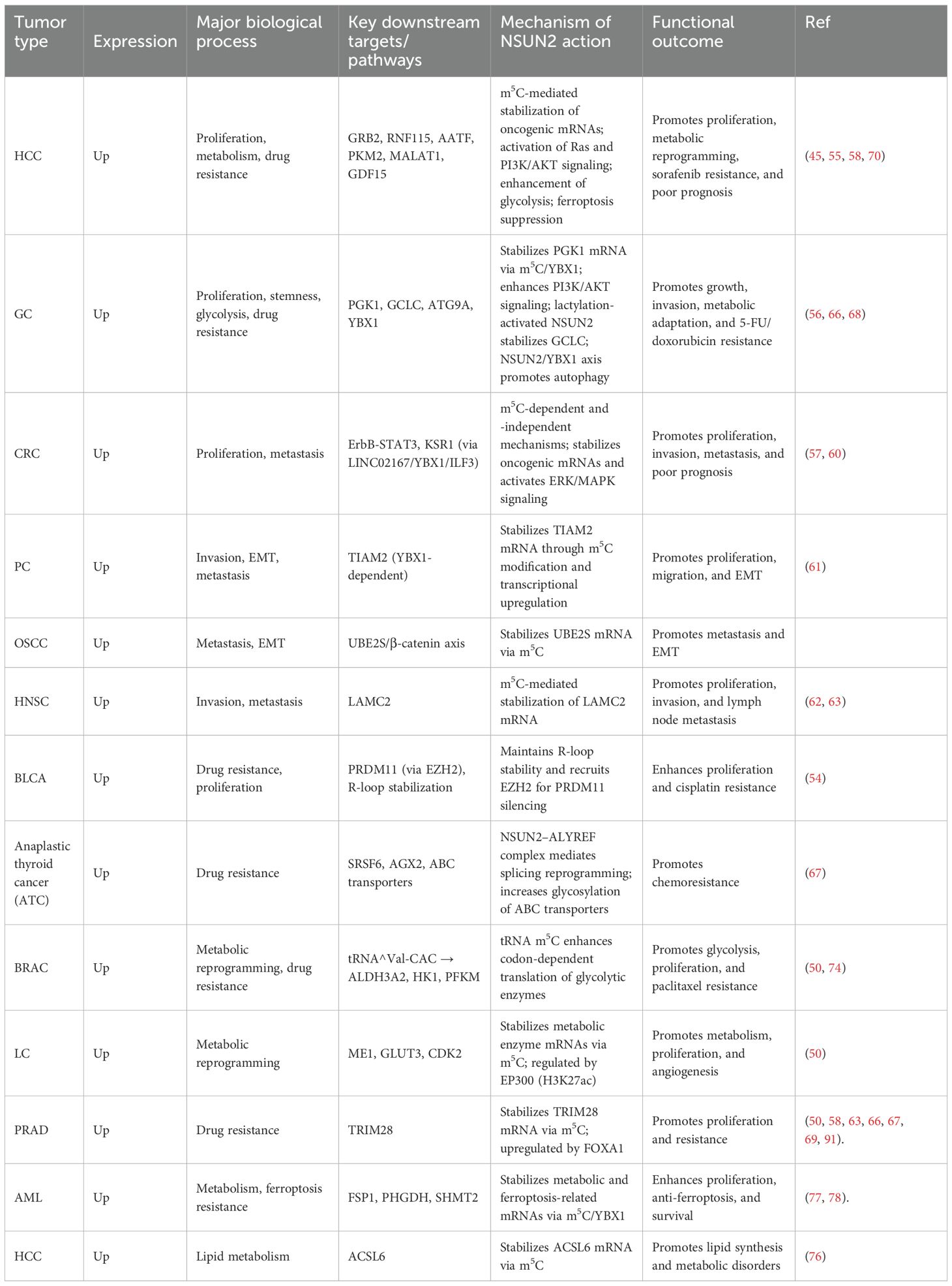 Multiple clinical studies have demonstrated that NSUN2 is significantly upregulated across various solid tumors and hematologic malignancies, including pancreatic cancer, acute myeloid leukemia (AML), osteosarcoma, colorectal cancer (CRC), head and neck squamous cell carcinoma (HNSCC), and gastric cancer (39, 53). High NSUN2 expression is generally associated with advanced tumor stage, enhanced tumor invasiveness, increased metastatic risk, and predicts reduced overall survival (OS) and progression-free survival (PFS). Furthermore, NSUN2 expression can be assessed through histological analysis or RNA sequencing, providing valuable information for tumor diagnosis, prognostic evaluation, and therapeutic response prediction (81). Given its multifaceted roles in tumor initiation, proliferation, metastasis, and drug resistance, NSUN2 serves not only as a potential biomarker but also as a candidate target for therapy. Targeting NSUN2 and its downstream signaling axes, such as TIAM2, FSP1, UBE2S, and PHGDH, holds promise for improving treatment responses in cancer patients (24, 29). Such strategies could be combined with chemotherapy, immunotherapy, or molecularly targeted agents to achieve synergistic antitumor effects.