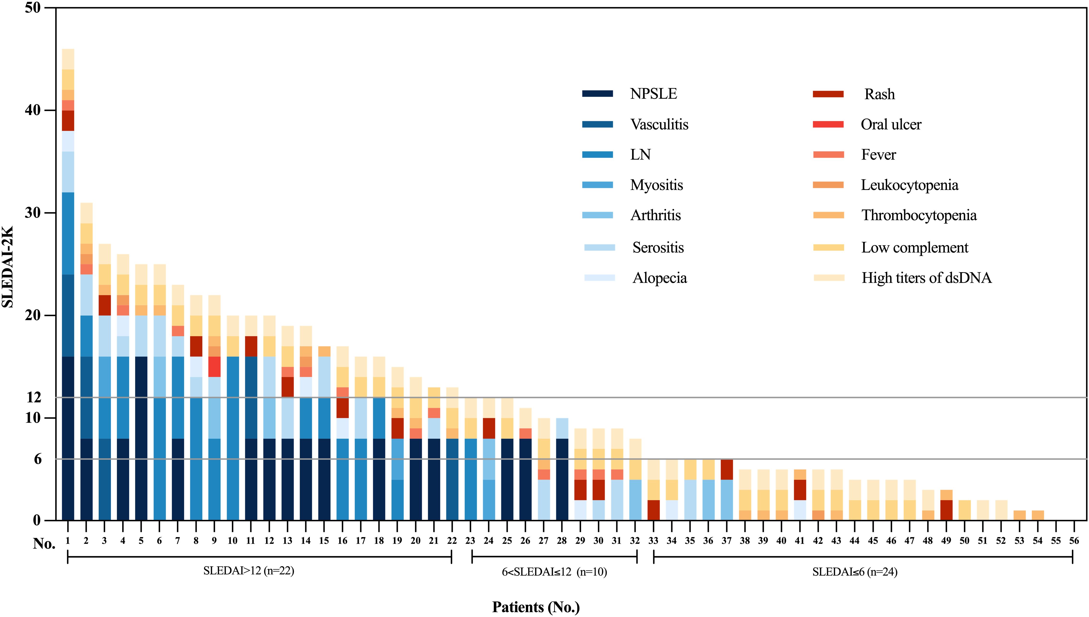 Figure 1. Baseline characteristics of SLE patients treated with obinutuzumab. The stacked bar chart displays individual patients’ SLEDAI-2K scores. Each bar represents a single patient and is stacked by individual SLEDAI-2K components. Patients are grouped by SLEDAI-2K score at baseline into three categories: SLEDAI ≤ 6 (n=24), 6<SLEDAI ≤ 12 (n=10), and SLEDAI>12 (n=22).