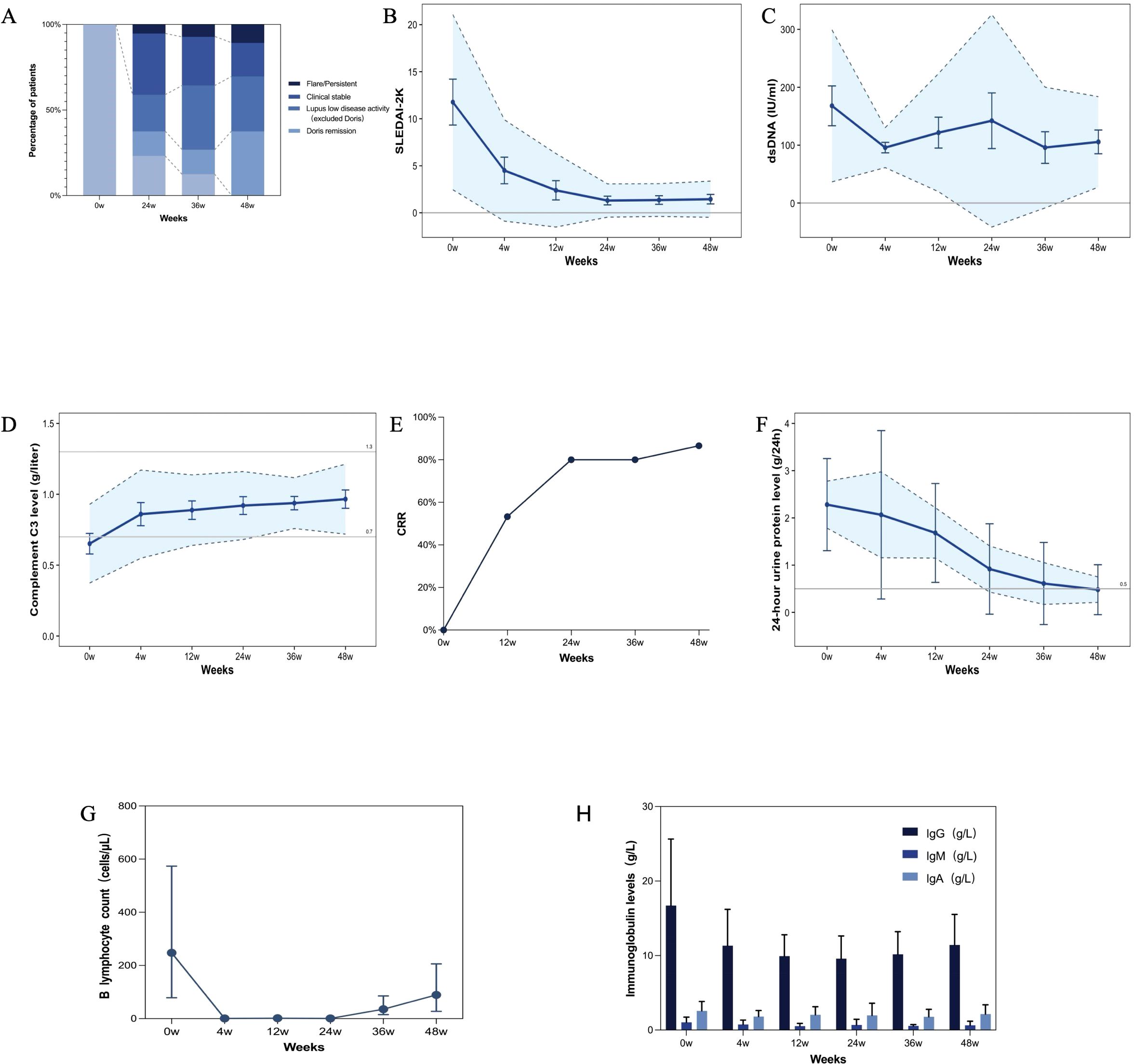 Figure 2. Clinical and serological improvements following obinutuzumab treatment in SLE patients. (A) Changes in disease states over time. (B-D) SLEDAI-2K Score (B), anti-dsDNA antibody level (C) and complement C3 (D) changes during the 48-week follow-up. The shaded areas represent the standard deviation (SD), the error bars illustrate 95% confidence intervals (CIs), and the lines indicate the mean value at each time point. (E) Complete renal response (CRR) rate changes in patients with lupus nephritis during follow-up. CRR was achieved in 53.3% of patients at week 12, 80% at week 24, and 86.6% at week 48. (F) Changes in proteinuria before and after obinutuzumab treatment. The solid line represents the mean values, the error bars illustrate 95% confidence intervals (CIs), and the shaded area indicates the standard error of the mean (SEM). (G) Dynamics of B cell numbers during the 48-week follow-up. The error bars illustrate 95% confidence intervals (CIs). (H) Mean serum immunoglobulin level changes during follow-up. The shaded areas represent the standard deviation (SD), and the lines indicate the mean value at each time point.