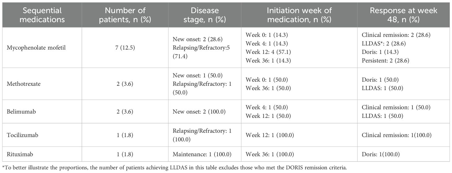 Glucocorticoids were employed in 55 patients (98.2%) at baseline, with a mean daily dose of 43.04 ± 18.19 (range: 0 to 60) mg, decreasing to 8.95 ± 9.78 mg/day (range: 0 to 50) by week 48 (95% CI, 6.3 to 11.6). Sequential immunosuppressive therapies included mycophenolate mofetil (MMF) (7 cases, 12.5%), methotrexate (MTX) (2 cases, 3.6%), belimumab (2 cases, 3.6%), rituximab (1 case, 1.8%) and tocilizumab (1 case,1.8%). Most patients receiving MMF had relapsing or refractory disease. Of these, five were already on MMF at baseline, while two initiated MMF treatment later at week 4 and 12. Other medications, including MTX, belimumab, tocilizumab, and rituximab, were introduced at variable time points, mostly after week 12. Details on these therapies and corresponding outcomes are provided in Table 2. Besides, a total of 13 patients (23.2%) received a second dose of obinutuzumab at week 48, among whom 2 (15.4%) were re-treated due to disease flare, while the remaining 11 (84.6%) received the second dose as consolidation therapy.
