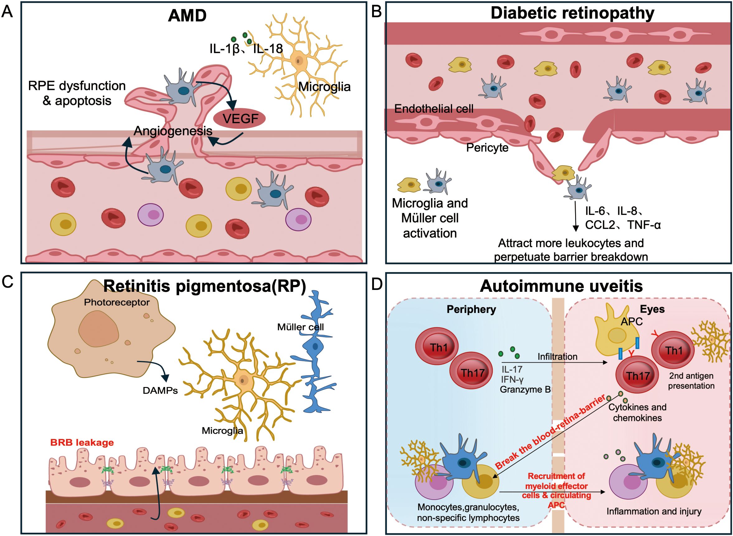 Figure 2. Disease-specific routes to breach retinal immune privilege.(A) AMD: complement-decorated drusen and subretinal myeloid accrual drive para-inflammation; outer BRB compromise emerges with choroidal neovascularization (CNV). (B) DR: pericyte loss and inner BRB leakage initiate leukostasis, followed by cytokine-driven edema and ischemia. (C) RP: degeneration-induced microglial activation leads to loss of tolerogenic cues and outer BRB integrity, permitting CCR2+ monocyte and T cell entry with subsequent autoreactivity. (D) Non-infectious (autoimmune) uveitis: Activated Th17 and Th1 cells breach the BRB and release cytokines and chemokines that recruit myeloid effectors and circulating antigen-presenting cells (APCs). Recruited APCs from the circulation provide a secondary antigen-presentation event required for full expression of spontaneous uveitis, whereas in the EAU model this role is fulfilled by resident microglia. Together these interactions amplify intraocular inflammation and tissue injury.