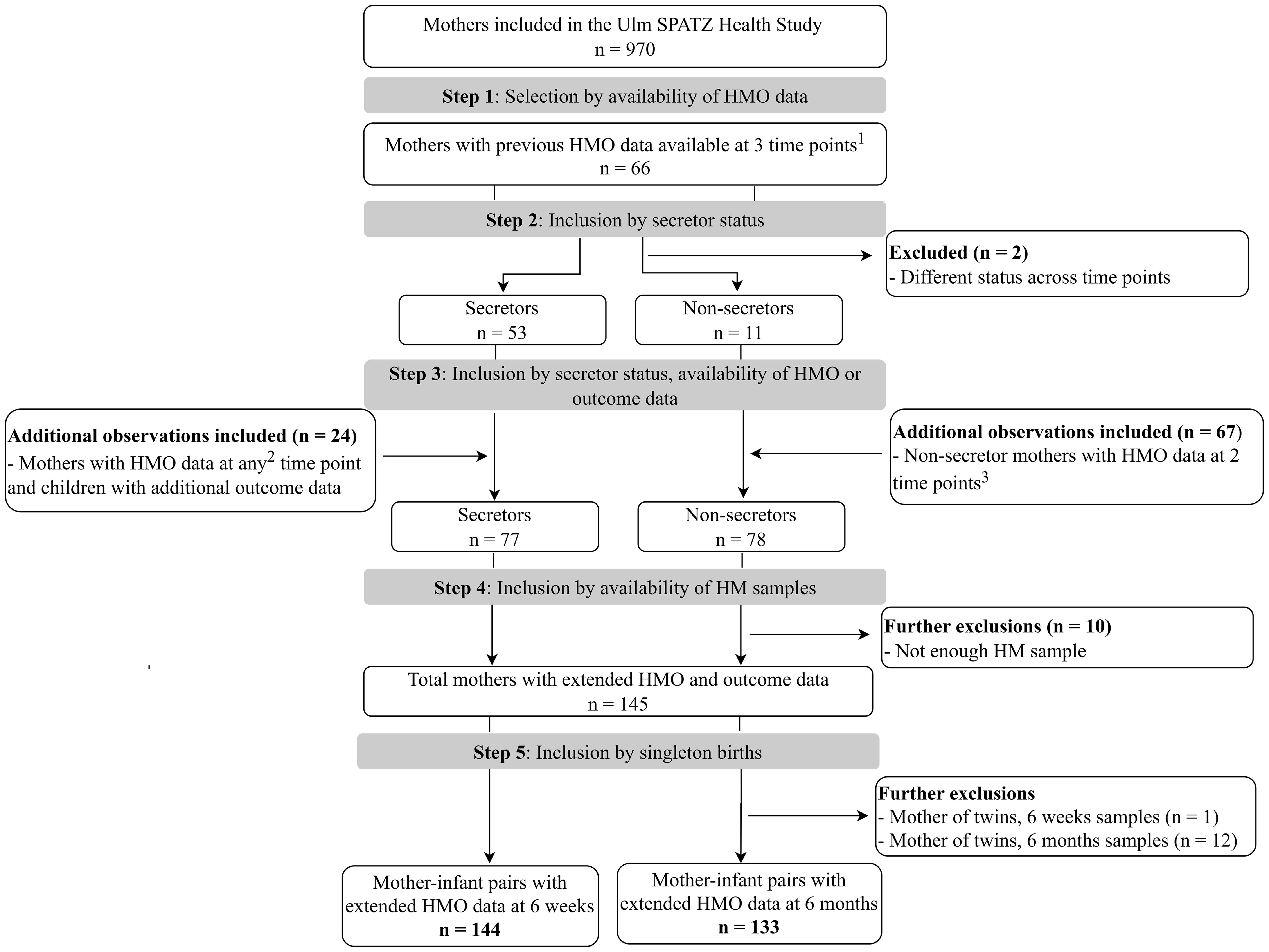 Figure 1. Flowchart showing the selection process of mother–infant pairs with human milk samples for advanced human milk oligosaccharide (HMO) analysis included in this study. Only mothers with HMO data and consistent secretor status were eligible for the extended HMO analysis. The upper division of the diagram shows separation by maternal secretor status (left = secretors; right = non-secretors). The lower division represents the availability of HMO data at different time points (6 weeks and/or 6 months). All data are from the Ulm SPATZ Health Study, no additional participants were included from other sources. The final sample size included in the study comprised 145 mothers (144 mother–infant pairs with HMO data at 6 weeks, and 133 pairs with HMO data at 6 months. 1All three time points, i.e., 6 weeks, 6 months, and 12 months; 2at any one of the time points; 3at both 6 weeks and 6 months. HM, human milk; HMO, human milk oligosaccharide.