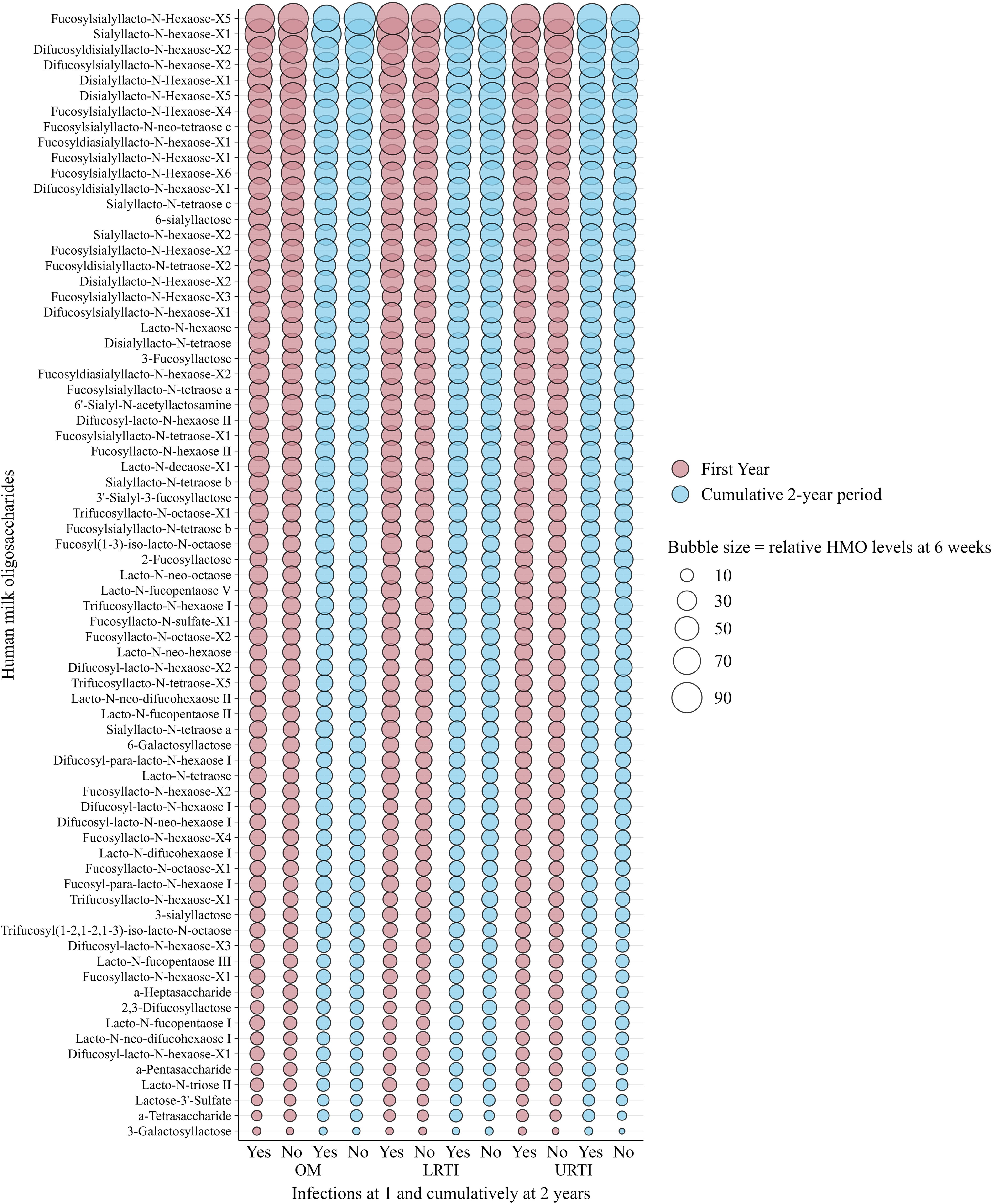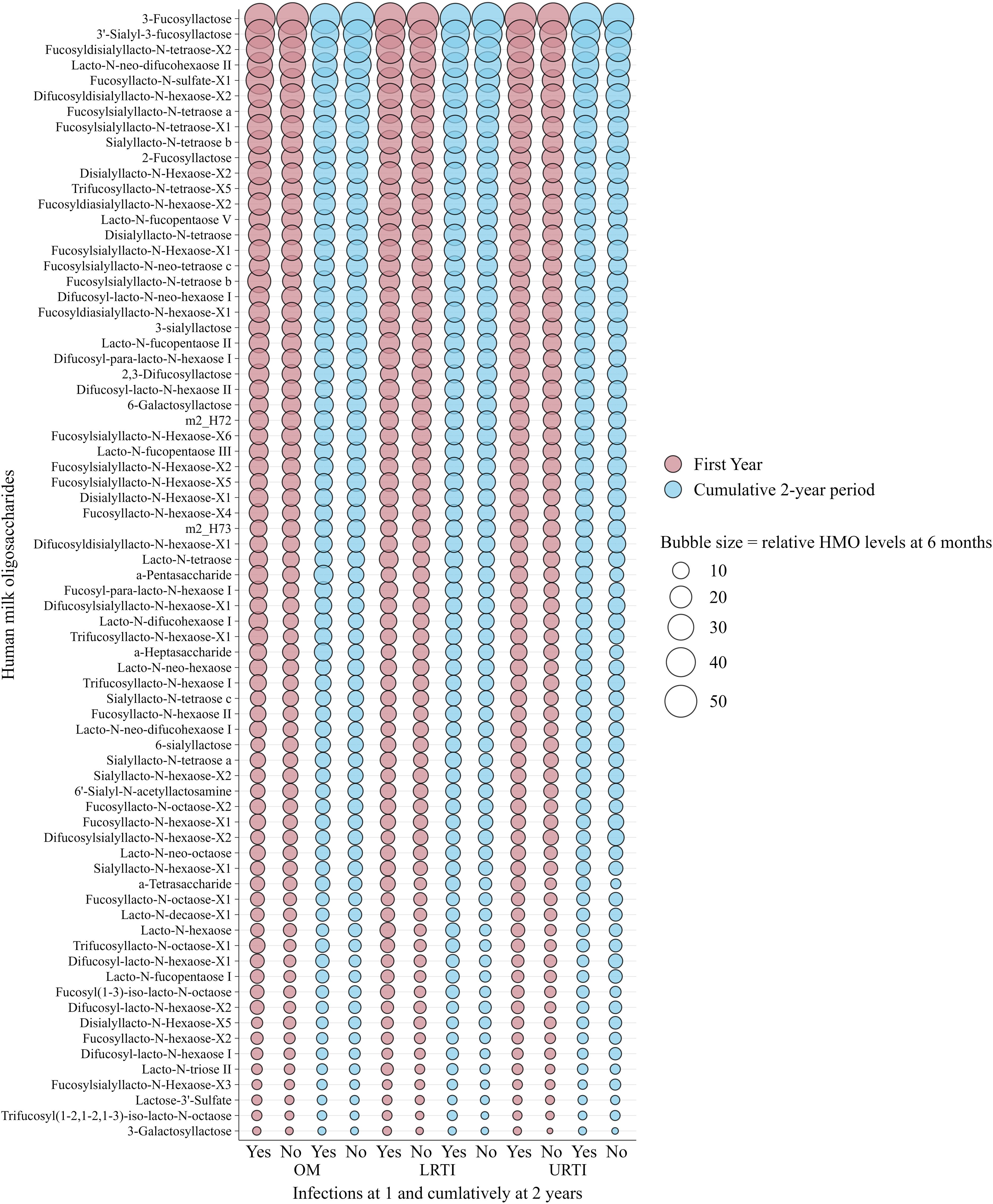 Figure 3. Bubble plot showing weighted relative means of 71 human milk oligosaccharide levels quantified from human milk sampled at 6 months of lactation and infections in infants in the first and cumulatively up to the second year of life in the Ulm SPATZ Health Study. Bubble size reflects relative levels of HMO structures calculated from HMO-specific calibration functions and serves as a descriptive visualisation of the dataset and does not depict statistical differences. HMO, human milk oligosaccharides; OM, otitis media; LRTI, lower respiratory tract infections; URTI, upper respiratory tract infections.