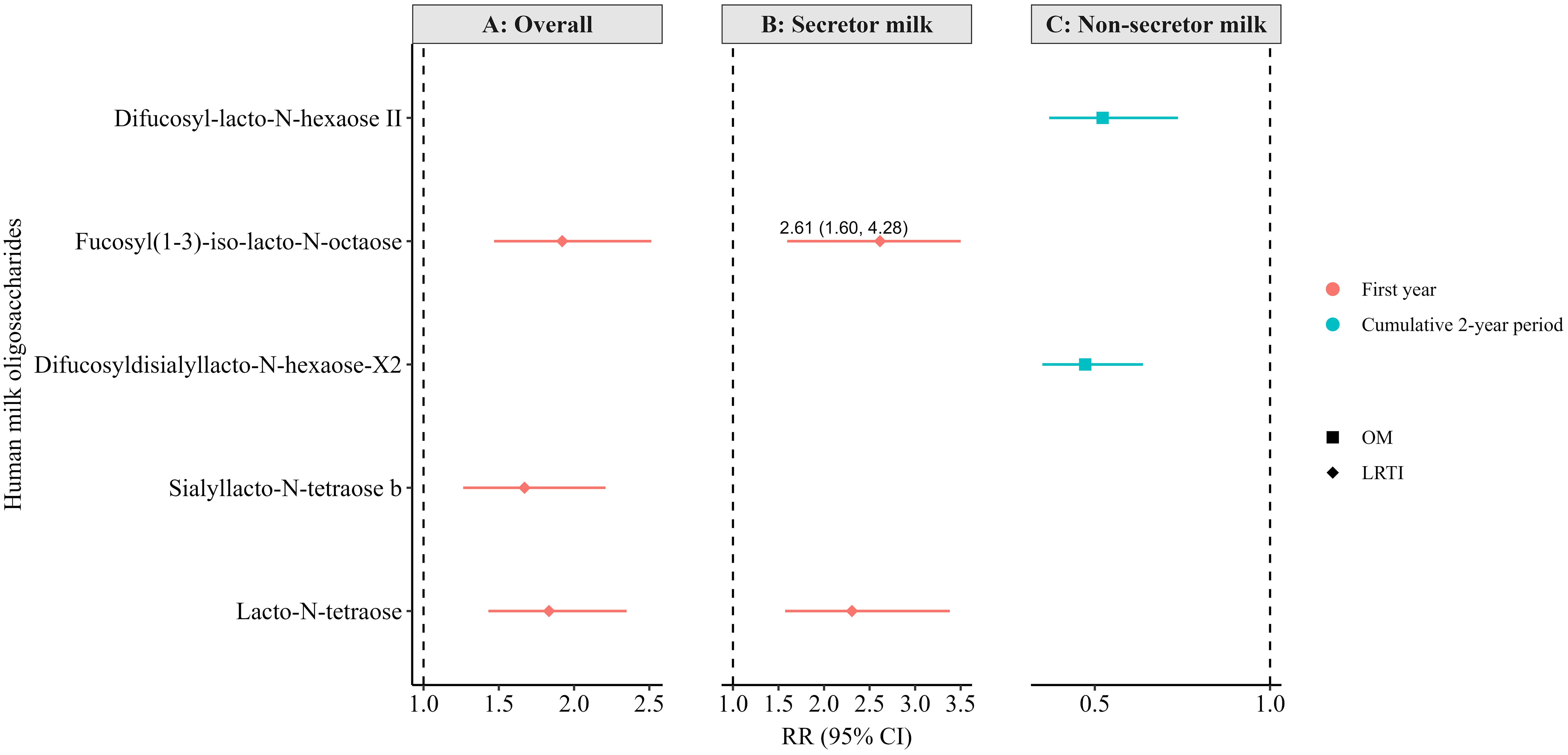 Figure 4. Adjusted associations between human milk oligosaccharides in overall (non-stratified) (A), secretor (B), and non-secretor milk (C) measured at 6 weeks of lactation and infections in the first or cumulatively up to the second year of life in the Ulm SPATZ Health Study. RR estimates for panel A were weighted to account for the overrepresentation of non-secretors in the human milk subset, ensuring results reflected the intended 80:20 secretor: non-secretor distribution. All associations shown here were statistically significant following correction for multiple testing (FDR <0.010). Associations determined by modified Poisson regression. Models adjusted for batch, child sex, duration of exclusive breastfeeding (weeks), and gestation age (weeks). OM, otitis media; LRTI, lower respiratory tract infections; RR, risk ratio; CI, confidence intervals.