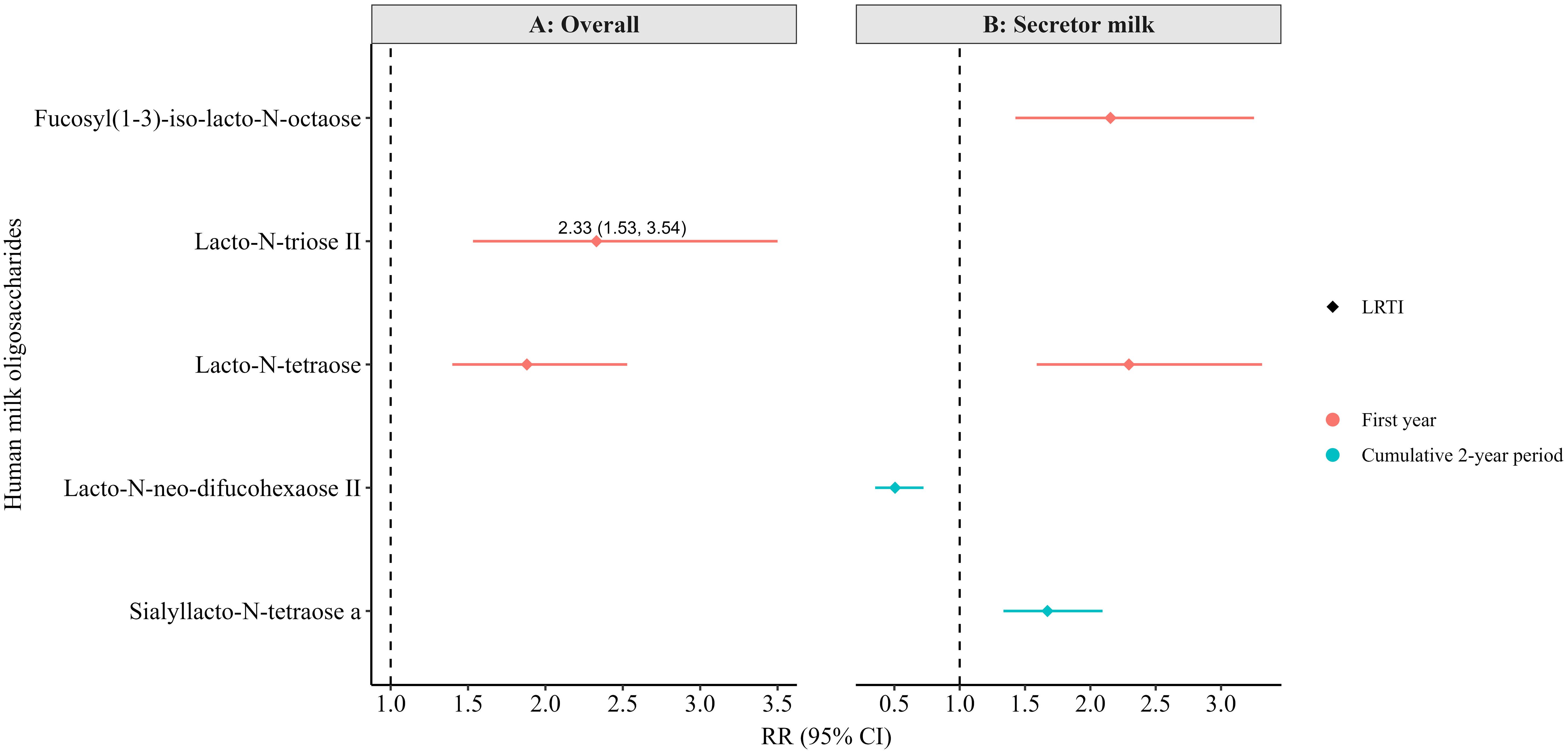 Figure 5. Adjusted associations between human milk oligosaccharides in overall (non-stratified) (A) and secretor milk (B) measured at 6 months of lactation with infections in the first or cumulatively up to the second year of life in the Ulm SPATZ Health Study. All associations shown were statistically significant after correction for multiple testing (FDR<0.010). RR estimates for panel A were weighted to account for the overrepresentation of non-secretors in the human milk subset, ensuring that results reflected the intended 80:20 secretor: non-secretor distribution. Associations determined by modified Poisson regression. Models adjusted for batch, child sex, duration of exclusive breastfeeding (weeks), and gestation age (weeks). OM, otitis media; LRTI, lower respiratory tract infections; weighted RR, risk ratio determined using weighted secretor status; CI, confidence intervals.