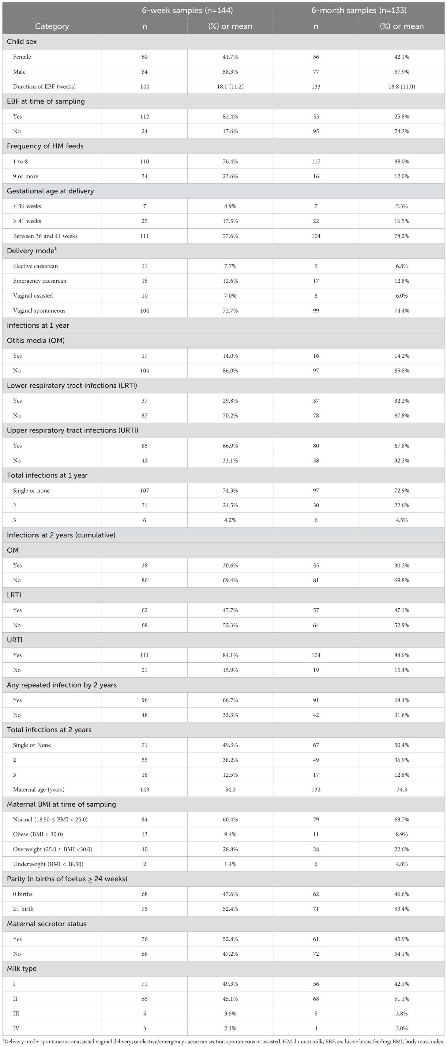 A total of 73 individual HMO structures were measured in a blinded fashion using liquid chromatography coupled with electrospray-ionization ion mobility quadrupole time-of-flight mass spectrometry (LC-ESI-IM-qTOF-MS) at Danone Research & Innovation (Utrecht, NL), as previously described (19, 21). Briefly, individual HMO structures were identified and quantified by LC-ESI-IM-qTOF-MS in negative ion mode. Quantification of relative HMO levels was done for 73 HMOs comprising neutral, acidic, and sulphated HMOs. The four common human milk types were determined for each sample based on the quantified levels of specific HMOs as follows (19): (i) samples with LNFP I and lacto-N-difucohexaose I (LNDFH I) below the limit of quantification (<LLOQ) were classified as type II; (ii) those with LNFP II and LNDFH I <LLOQ were classified as type III; (iii) those with LNFP I, LNFP II, and LNDFH I all <LLOQ were classified as type IV; (iv) all remaining samples were categorized as type I. Secretor milk comprised type I and III milk, whereas non-secretor milk comprised type II and type IV milk. A total of n=144 and n=133 mother–infant pairs with HMO data at 6 weeks and 6 months, respectively, were included in the current analysis and thus had a complete set of HMO and outcome data (Figure 1).