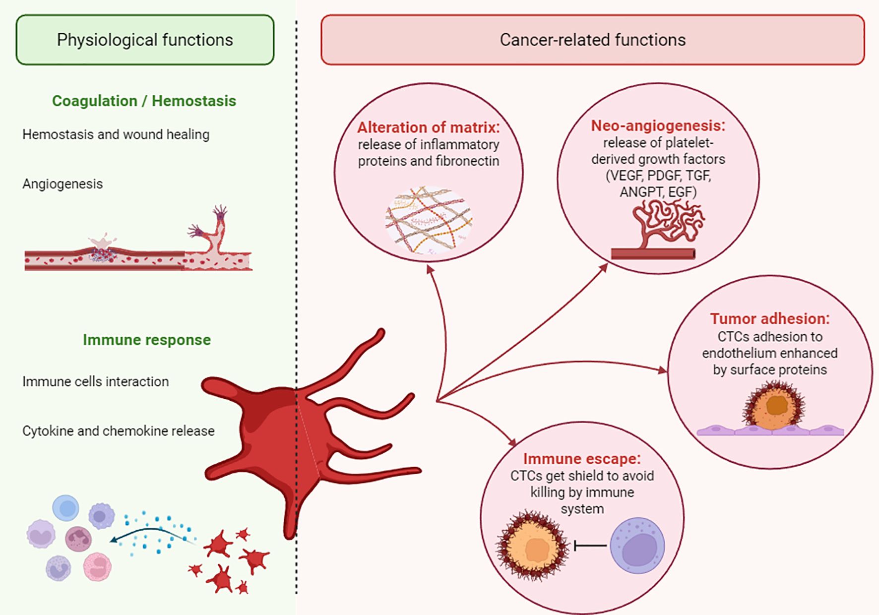 Figure 1. Physio-pathological roles of platelets. A schematic illustration of the dual role of platelets. The pathological roles of platelets in cancer are indicated as “cancer-related functions”.