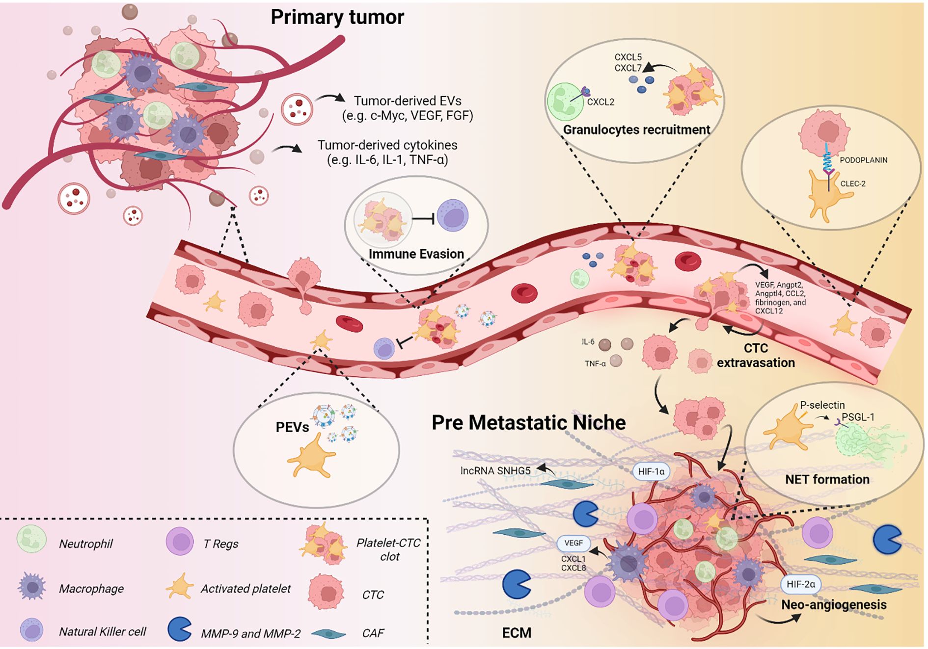 Collectively, platelets are central orchestrators of premetastatic and metastatic niche formation, regulating angiogenesis, immune evasion, vascular remodeling, and ECM dynamics. While many pathways have been elucidated, further studies are required to fully define their mechanistic contributions and therapeutic potential in metastasis.