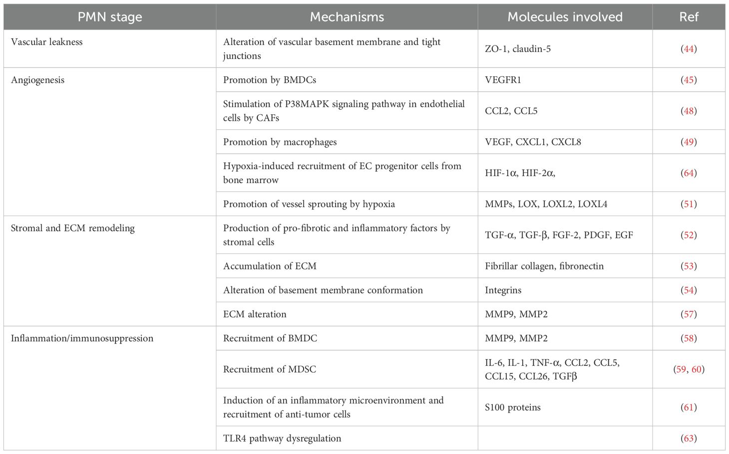 Besides the ECM context, inflammation and immunosuppression are two critical points, strictly correlated to each other in the PMN formation (41). It has been demonstrated that tumor cells release inflammatory cytokines (IL-6, IL-1, TNF-α), chemokines (CCL2, CCL5, CCL15, CCL26), and growth factors (TGFβ), which ultimately recruit BMDCs such as myeloid-derived suppressor cells (MDSCs) and create a favorable niche for tumor development (59, 60). For example, S100 proteins have been linked to inflammation and the recruitment of hematopoietic progenitor cells and immune suppressor cells, such as regulatory T cells (Tregs), and tumor-associated macrophages, which help tumors evade immune detection (61). Similarly, macrophages resident in premetastatic sites were shown to contribute to the establishment of an immunosuppressive microenvironment with inflammatory characteristics (62). Furthermore, deregulated TLR4 signaling in tumor cells can lead to an inflammatory response, which potentiates tumor cells’ resistance towards cell death, proliferation, invasion, and metastasis (63). All the processes involved in the PMN cascade are summarized in Table 1.