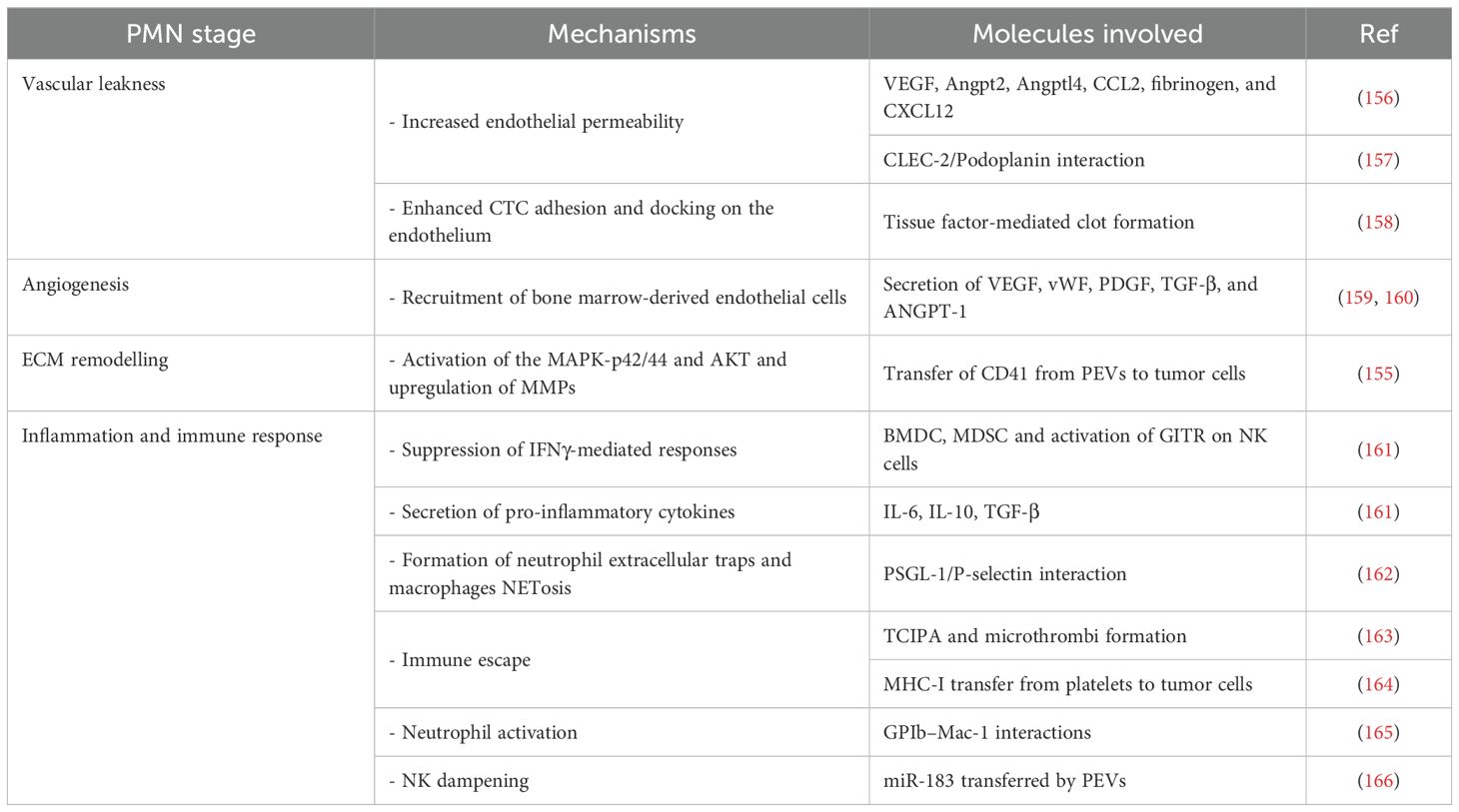 During cancer metastasis, TEPs play a pivotal role in PMN formation as illustrated in Table 2 (167). One key mechanism is tumor cell–induced platelet aggregation (TCIPA), in which platelets encapsulate CTCs, shielding them from immune surveillance and promoting metastatic spread via microthrombus formation (163). TCIPA also fosters lung metastasis in malignant melanoma models through the release of chemokines (CCL2, CXCL12, IL-1α, IL-1β) and recruitment of TAMs, driving their polarization toward an M2 phenotype (168).