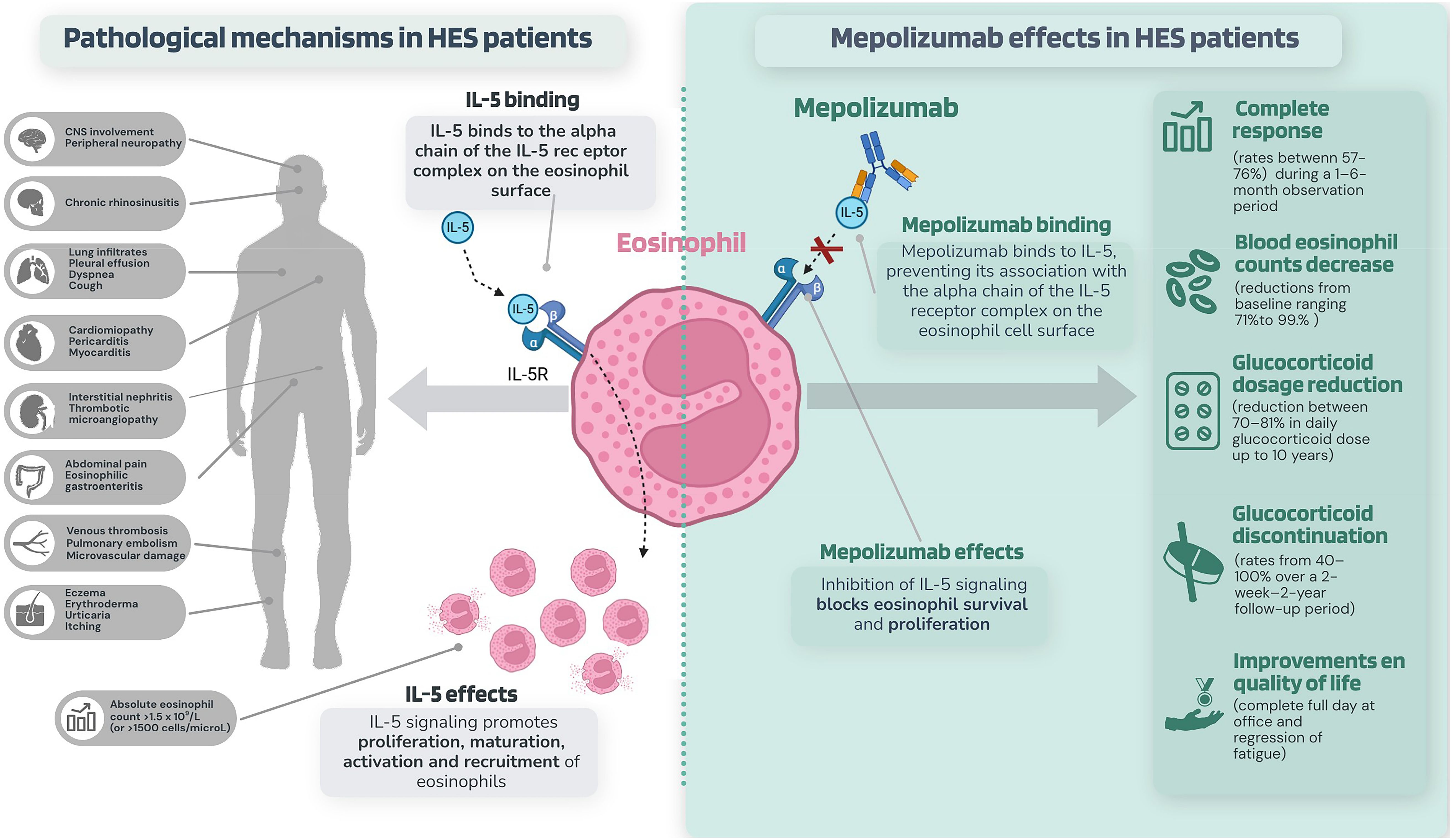 The overall therapy objectives for patients with HES include the reduction of the absolute eosinophil count (AEC), amelioration of signs and symptoms, and prevention of disease progression (10), while minimizing therapy complications. Except for patients with a secondary cause of HES, for whom treatment should be targeted at the underlying disease, glucocorticoids remain the primary therapeutic approach for the treatment of most forms of HES, as well as severe and potentially life-threatening manifestations of HES in acute situations (11). For patients diagnosed with HES exhibiting an insufficient response to glucocorticoids or demonstrating intolerance to glucocorticoids, additional therapeutic options are recommended. These options may include imatinib (especially for subtypes associated with gene fusions involving PDGFRA or PDGFRB (12) in which imatinib should be the first line of treatment), immunomodulatory agents (such as interferon alpha, ciclosporin, or azathioprine), cytoreductive therapy (hydroxycarbamide), or monoclonal antibody therapy (mepolizumab and others) (13). The selection of treatment is dependent upon several factors, such as the type of HES, severity (cardiac, central nervous system, or thrombotic involvement), clinical course (continuous progression or recurrent episodes), and the patient’s individual characteristics (age, potential comorbidities) (14). Traditional treatments, such as glucocorticoids and cytotoxic and immunomodulatory drugs, exhibit variable efficacy and significant side effects (15). Patients diagnosed with early HES have a high initial response rate when treated with glucocorticoids as first-line monotherapy, with up to 85% of patients showing a positive response within one month of treatment. Nevertheless, a considerable percentage of these patients experience substantial adverse effects attributed to glucocorticoids or treatment resistance, with lack of efficacy being the most prevalent cause of treatment discontinuation (3). Given the prominent involvement of IL-5 as the primary cytokine responsible for promoting the survival and persistence of eosinophils in the etiology of HES (16), it has been suggested that therapies aimed at inhibiting eosinophils may have the potential to result in favorable therapeutic effects.