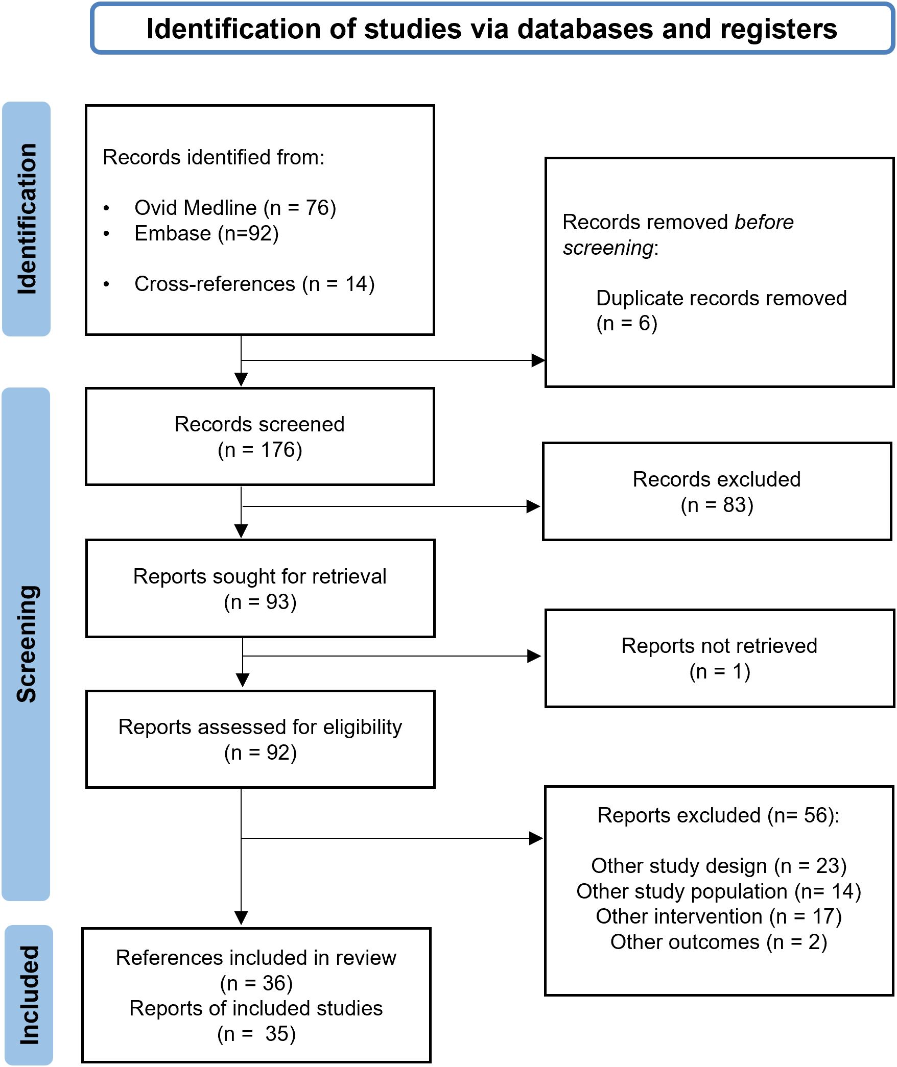 The electronic database searches identified 168 potentially eligible publications or abstracts. A manual search using the bibliography of select articles identified 14 records. After excluding 6 duplicate references and 83 publications or abstracts that did not meet the eligibility criteria (and were considered irrelevant), 93 full texts were retrieved to confirm their eligibility. Of the available references, it was not possible to access the complete text of one document, and a total of 56 entries were excluded. The main reasons for exclusion were study design (i.e., clinical trial) and intervention (i.e., medications other than mepolizumab). A total of 36 papers or abstracts that met the inclusion criteria were included in this review. Among selected studies, we combined 2 publications based on the same research (21, 22). We finally included 36 references covering 35 original studies. The PRISMA study flow diagram is illustrated in Figure 2.