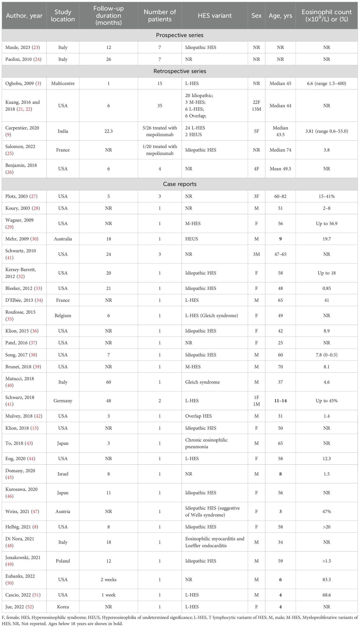 Of the 35 studies that examined the effectiveness and safety of mepolizumab in real-world settings in 105 patients with HES, 2 (5.7%) were prospective series (23, 24), 5 (14.2%) were retrospective series (3, 9, 21, 25, 26), and 28 (80%) were case reports (8, 15, 27–52).