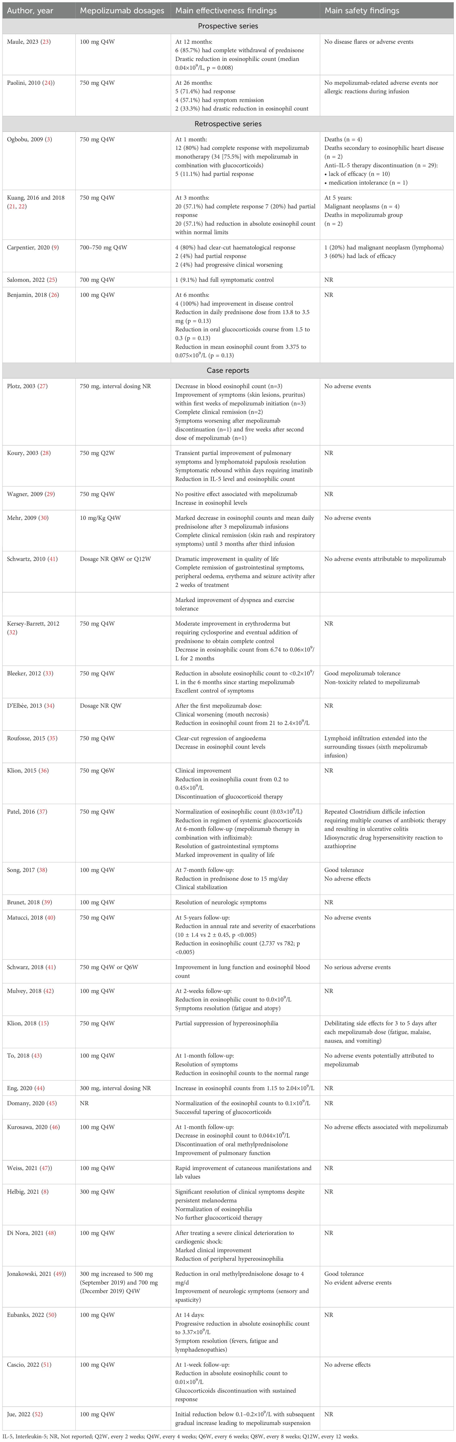 The findings from the large number of patients included in our review indicate that the clinical advantages identified with mepolizumab in clinical trials regarding various subtypes of HES (53, 54) were also present in the real-world population, particularly in L-HES. The safety profile of mepolizumab is encouraging, even when considering its use for conditions beyond HES. While HES studies provide valuable insights, the real strength resides in the consistency of safety data observed in other, more established indications such as eosinophilic granulomatosis with polyangiitis, severe eosinophilic asthma, and nasal polyposis. Since studies of these other indications have notably more extensive data (larger number of patients and longer follow-up periods) in comparison to HES studies, they provide a more robust understanding of the mepolizumab safety profile in a broader context (55, 56).