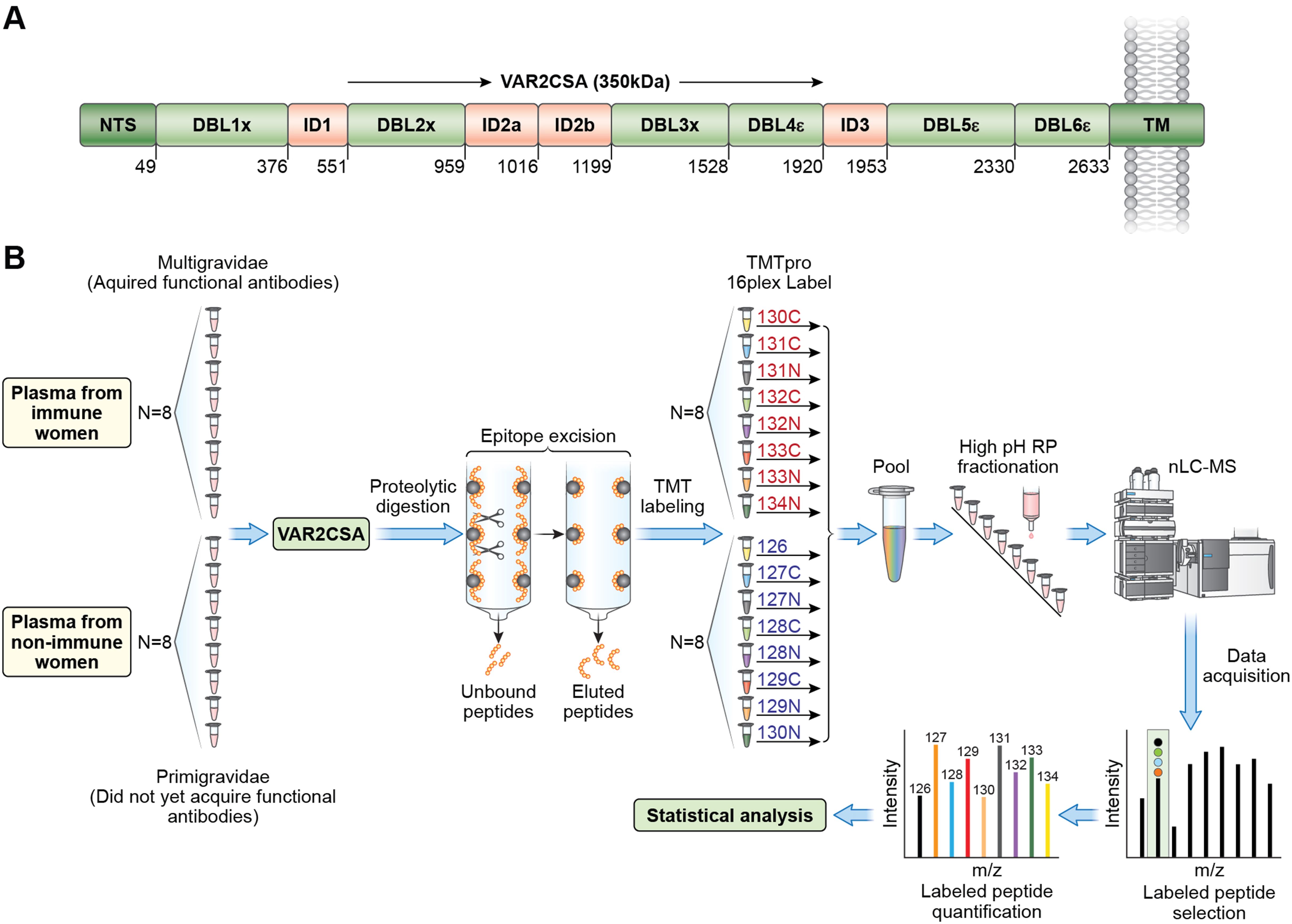 Diagram illustrating a scientific workflow related to VAR2CSA epitope analysis. Panel A shows the structure of the VAR2CSA protein, indicating domains like NTS, multiple DBL and ID segments, and a transmembrane region. Panel B depicts a complex process involving plasma samples from immune and non-immune women. Antibodies from Plasma samples were allowed to bind to VAR2CSA for proteolytic digestion and epitope excision. Unbound and eluted peptides undergo TMT labeling, pooling, and high pH RP fractionation before being analyzed with nLC-MS and statistical analysis.