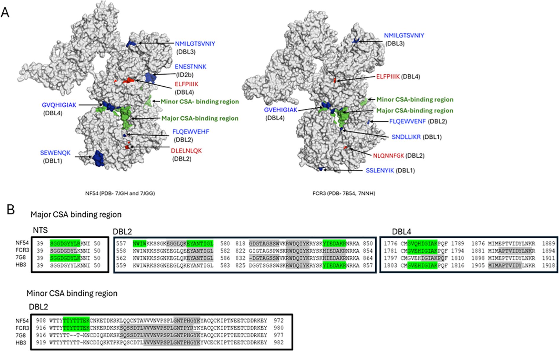 Molecular structure of VAR2CSA proteins, highlighting major and minor CSA binding regions labeled in green, with various epitope sequences marked in blue and red. The top image (A) shows two protein structures (NF54 and FCR3) with CSA binding sites. The bottom image (B) provides sequence alignments for major and minor CSA-binding regions, with sequences highlighted in green for emphasis of identified epitopes.