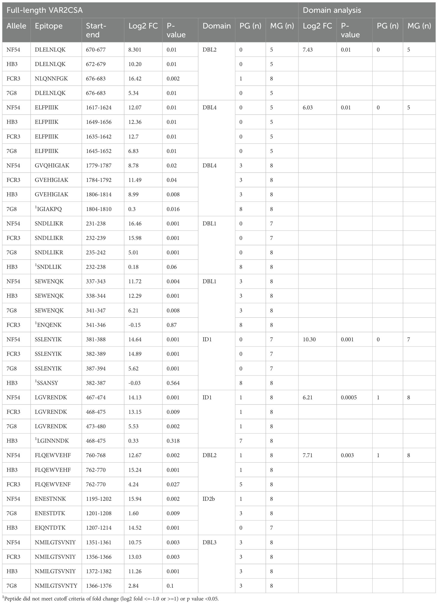 Previous analysis of IgG reactivity with VAR2CSA peptides described that peptides in DBL3 and DBL5 domains corresponding to amino acids 1350–1370 and 2045–2061 in 3D7 respectively are highly conserved, exposed on the surface of VAR2CSA and therefore accessible to antibodies. These peptides were preferentially recognized by plasma from females compared to males (38). In the current study, the peptide from DBL3 preferentially recognized by multigravidae IgG in 3 allelic forms is within the described region (Table 1). We also identified a peptide in DBL5 domain within the described region that was differentially recognized by multigravidae in 2 VAR2CSA alleles while there were no differences between primigravidae and multigravidae in the other 2 alleles (Supplementary Table S2 and Supplementary Data File 1). Previously, a peptide array of DBL4 domain identified a peptide preferentially recognized by sera from women that acquired anti-adhesion antibodies compared to women without anti-adhesion activity (39). This peptide was also identified in our study; however, the peptide was differentially recognized by IgG of multigravidae that acquired functional anti-adhesion antibodies compared to primigravidae that did not acquire functional antibodies in NF54 allele, while intensities were similar between primigravidae and multigravidae in the other 3 alleles (Supplementary Table S3).