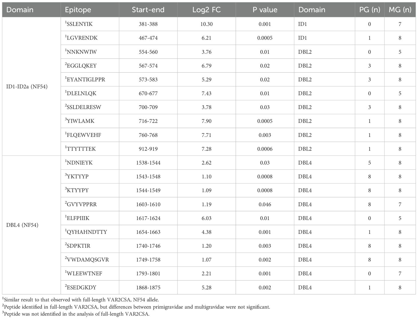 Table 2. Differentially recognized epitopes identified in ID1-ID2a and DBL4 domains.