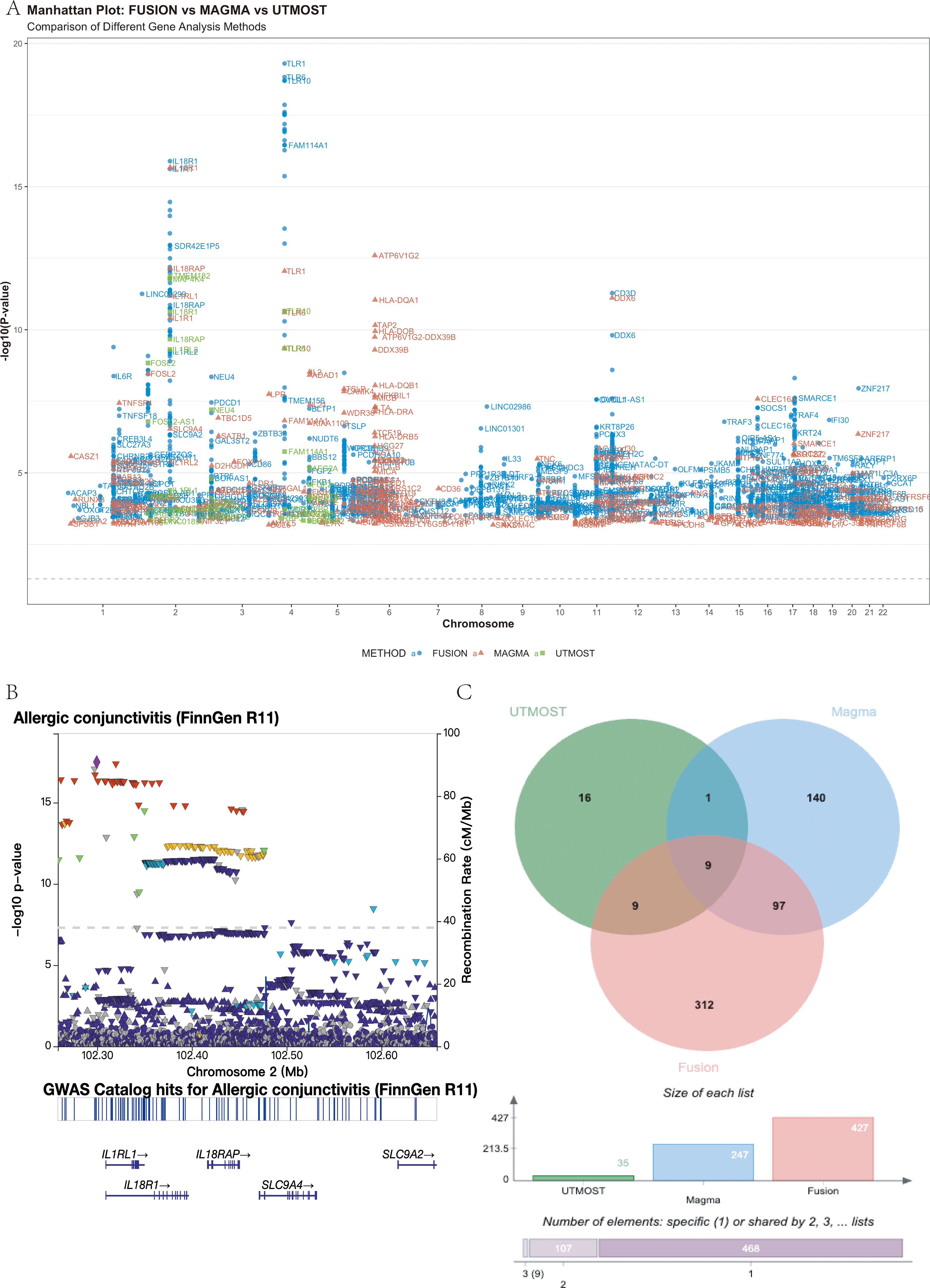 Panel A represents a Manhattan plot comparing gene analysis methods: FUSION, MAGMA, and UTMOST, plotted against chromosomes. Panel B shows a plot of allergic conjunctivitis data from FinnGen R11, displaying p-values and recombination rates on chromosome 2. Panel C includes a Venn diagram illustrating the overlap of elements between UTMOST, Magma, and Fusion, with a bar chart indicating the size of each list.