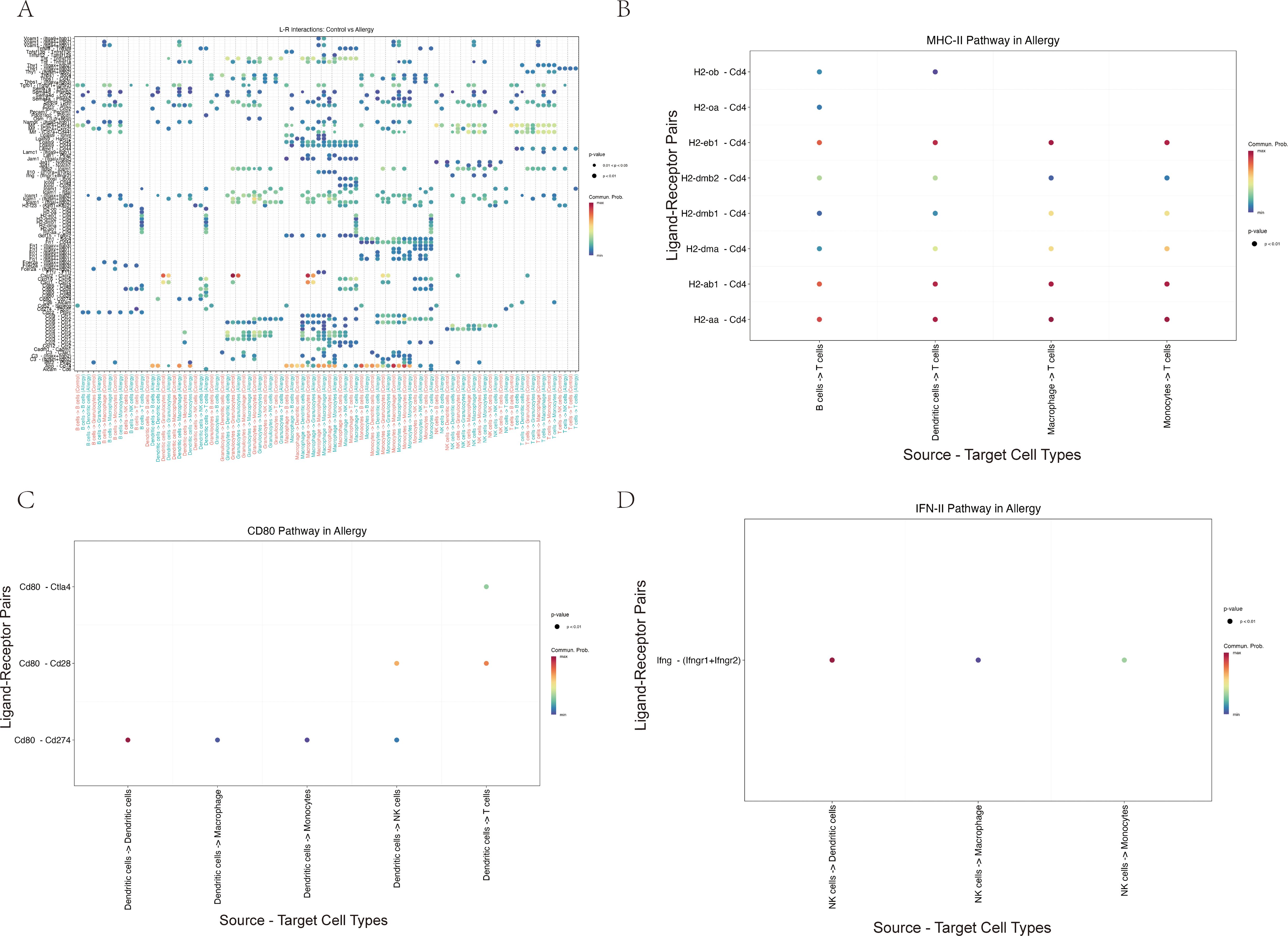 Cell-cell interactions are central to the initiation and regulation of immune responses (43). By applying CellChat to conjunctival scRNA-seq data, we observed substantial remodeling of the intercellular communication network in AC compared with controls. Both the number and overall strength of inferred signaling interactions were increased in the allergic group, particularly in pathways linked to antigen presentation (MHC-II) and T cell co-stimulation (CD80) (44). These findings suggest that AC is associated with a rewiring of immune communication toward more densely connected, pro-inflammatory circuits.