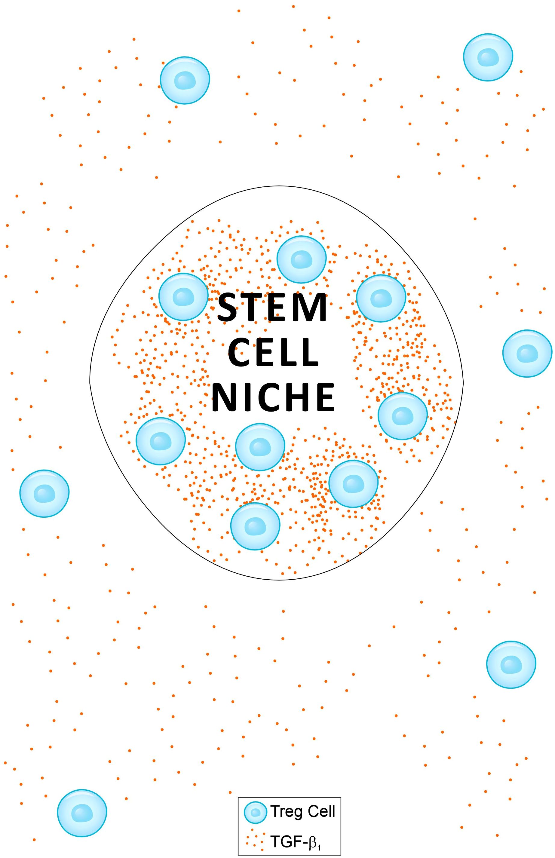 High Treg numbers and elevated TGF-β1 levels within HSC bone marrow niches induce HSC quiescence and confer immune protection to the niche. In contrast, HSCs and differentiated immune cells located outside the niches are active and unprotected. These differentiated immune cells exhibit a baseline activity rate in healthy animals at homeostasis, designated here as Ra(0).