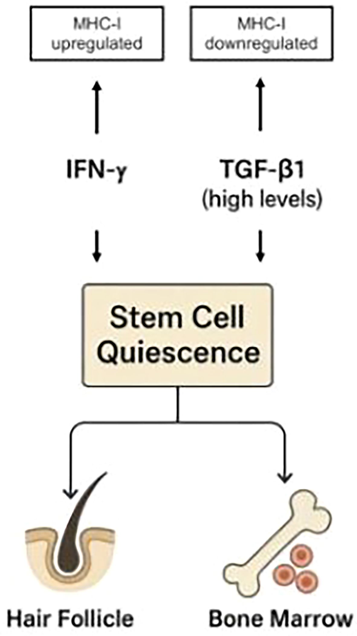 Figure 2. While both IFN-γ and high levels of TGF-β1 induce stem cell quiescence, they exert opposite effects on immune privilege: IFN-γ upregulates MHC-I expression, whereas TGF-β1 downregulates it. Similar mechanisms apply to hematopoietic stem cell niches in the bone marrow. This demonstrates that immune protection is not an inherent feature of quiescent stem cells, as previously proposed (104), but instead depends on the specific pathways that regulate quiescence. The TGF-β/Smad pathway not only induces quiescence in stem cells (100) but also drives MHC-I downregulation (9), thereby explaining the association between stem cell quiescence and immune privilege. In contrast, IFN-γ induces quiescence while upregulating MHC-I expression.