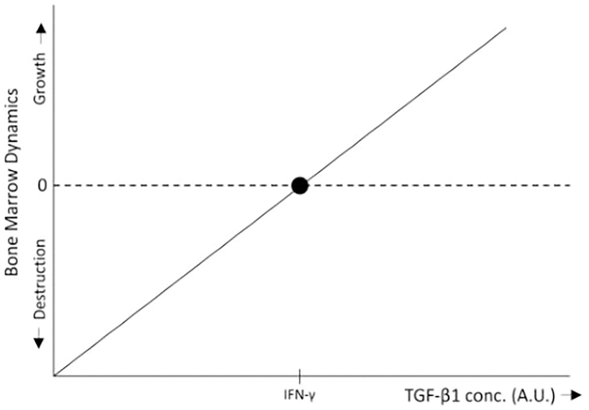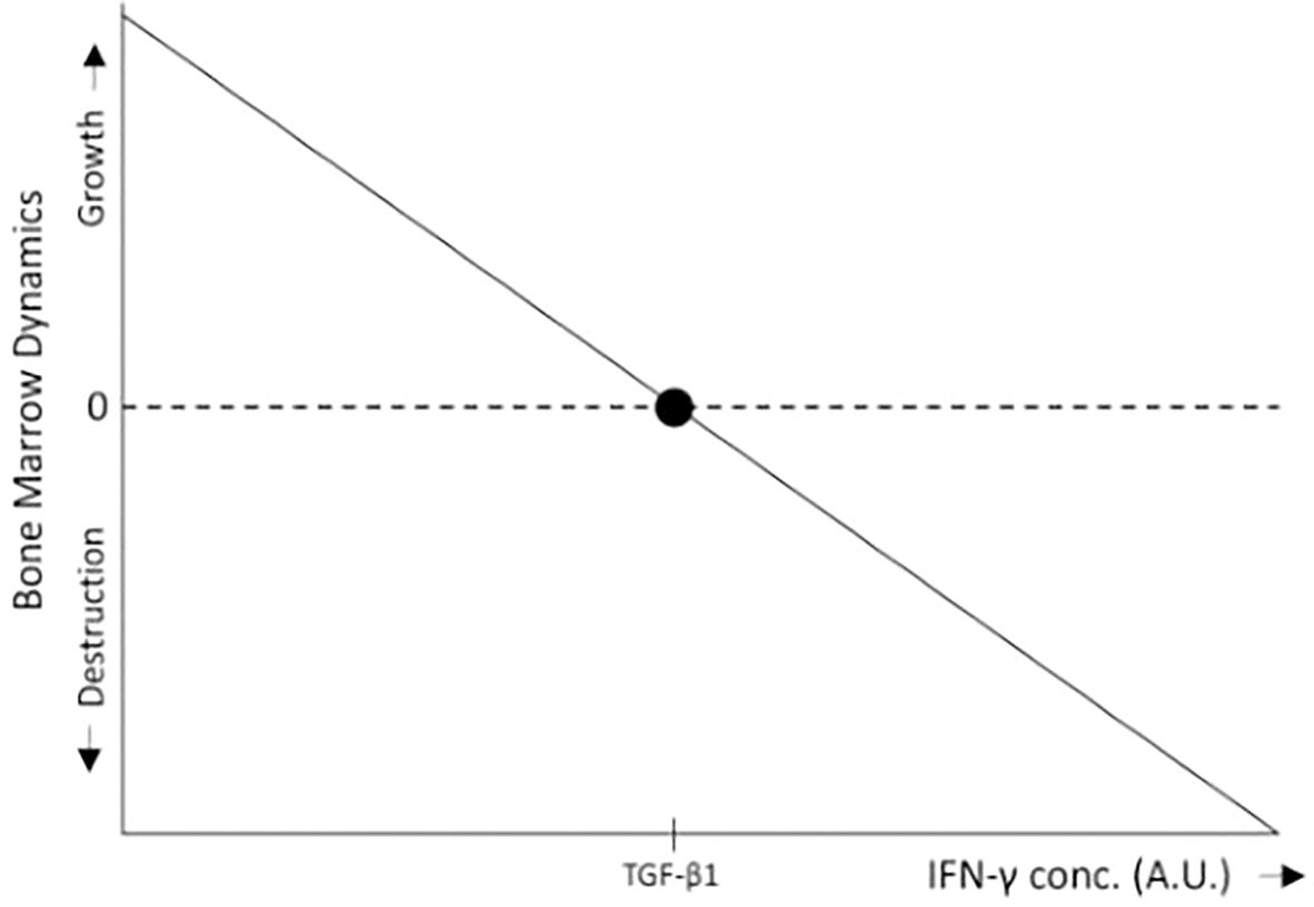 Figure 4. In the bone marrow, IFN-γ inhibits HSC proliferation, differentiation, and self-renewal (15, 16), thereby promoting bone marrow destruction through immune surveillance, whereas low levels of TGF-β1 stimulate HSC proliferation (34), leading to bone marrow growth. Within the range of low TGF-β1 concentrations, when IFN-γ levels fall below a certain threshold relative to TGF-β1, the proliferative effects of TGF-β1 predominate, resulting in bone marrow expansion. Conversely, when IFN-γ levels exceed this threshold, bone marrow destruction occurs. For simplicity, the schematic representation assumes a linear relationship between bone marrow growth and IFN-γ levels.