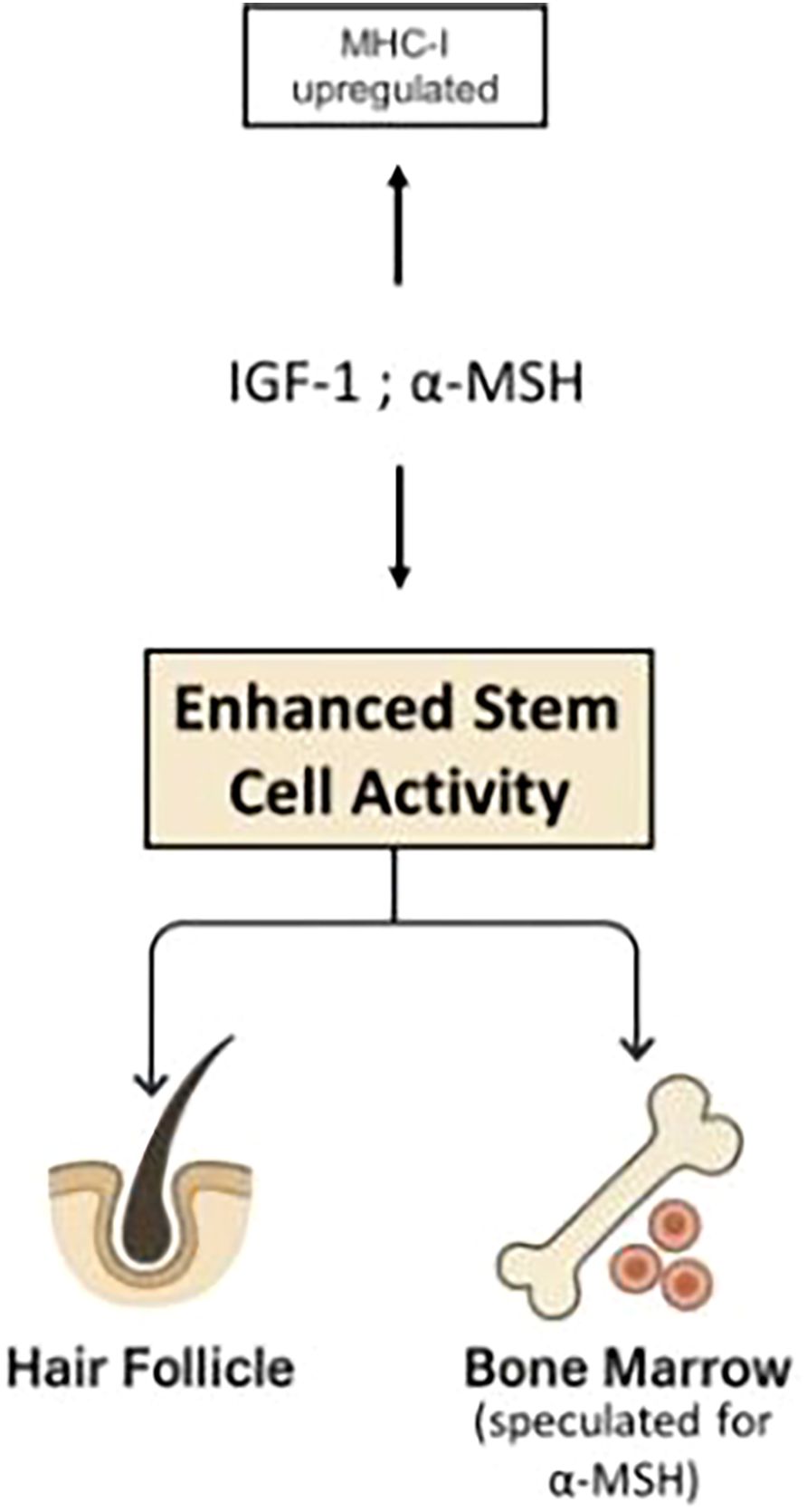 Figure 5. Agents such as α-MSH, IGF-1, which downregulate MHC-I expression in hair bulbs (9), also enhance stem cell renewal and proliferation (19–23). Both effects contribute to remission in alopecia areata.