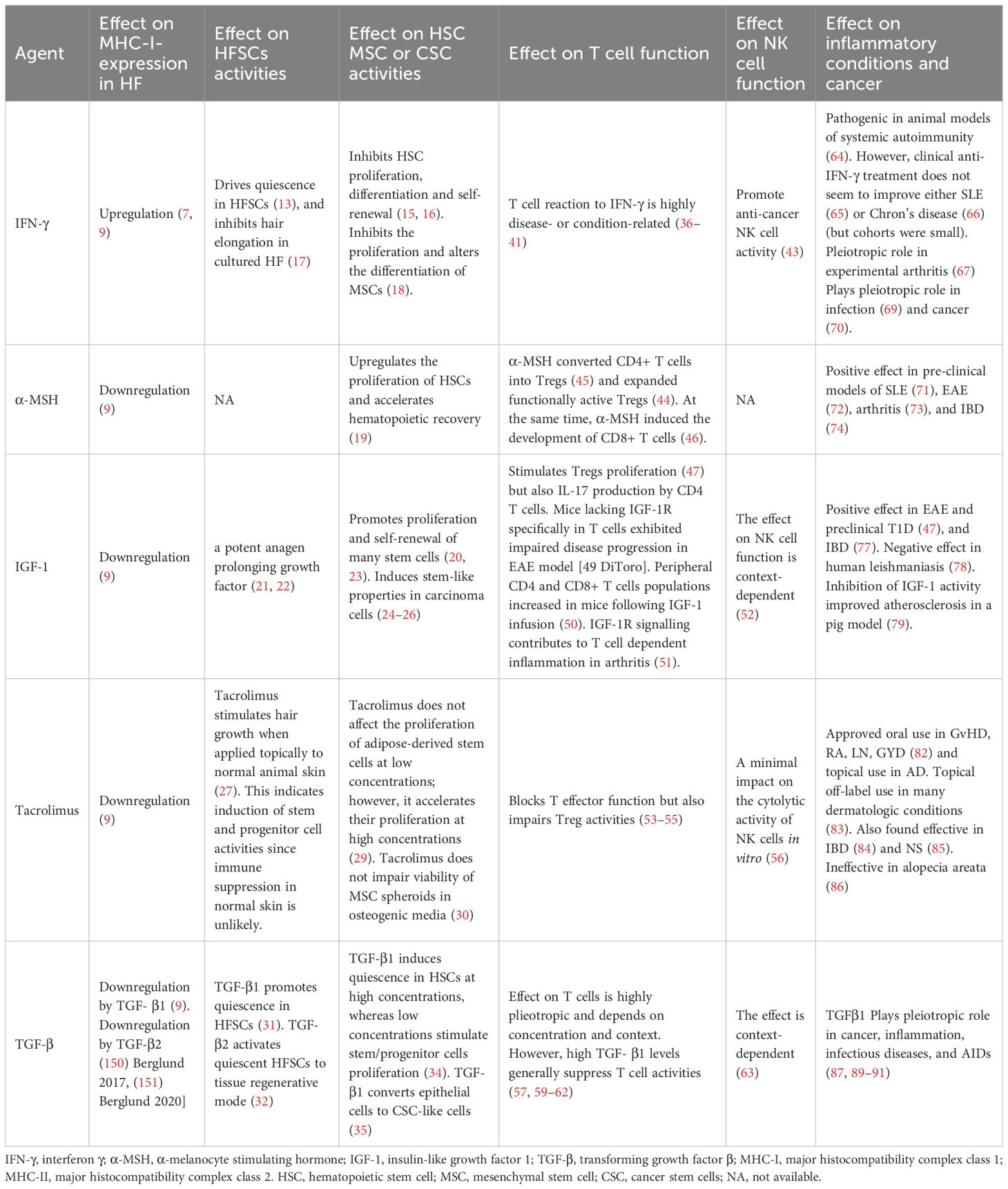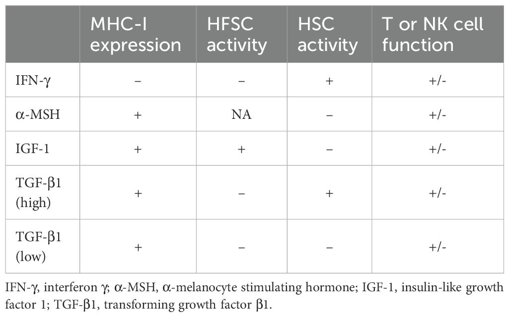 Table 2. The effect of agents that modulate hair follicle immune privilege on the promotion of remissions (+) or relapses (-) in alopecia areata through their effects on MHC-I expression, HFSC activity, HSC activity and T and NK cell function.