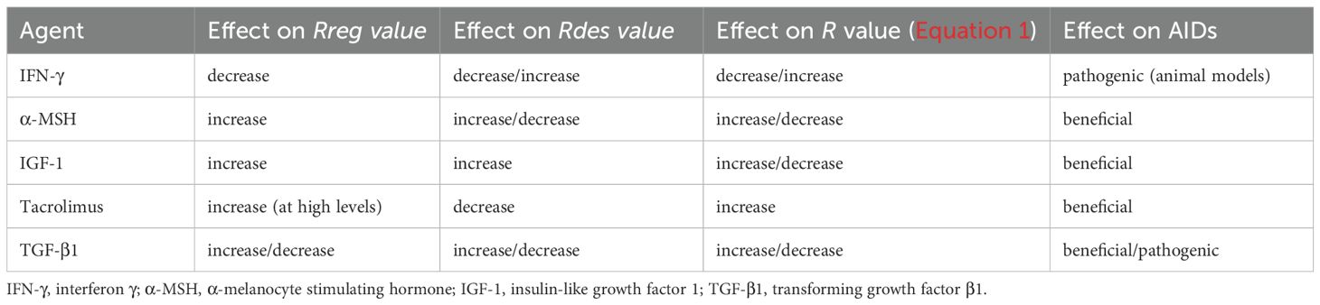 α-MSH and IGF-1, by enhancing stem cell activity and supporting tissue regeneration, contribute to an increase in Rreg in Equation 1. However, because both agents stimulate Treg proliferation while also enhancing Teff activity—with opposing effects on immune attack—their net impact on Rdes is not immediately evident. Given that Treg function is impaired in most AIDs (98), the influence on Teff cells is likely to be more consequential. Given that both agents have been shown to alleviate symptoms in several AIDs, it is likely that the regenerative enhancement through stem cell activation outweighs the cytotoxic activation they also promote. This discussion excludes the effects of both agents on NK cells, as relevant data are either unavailable or context-dependent and difficult to predict.