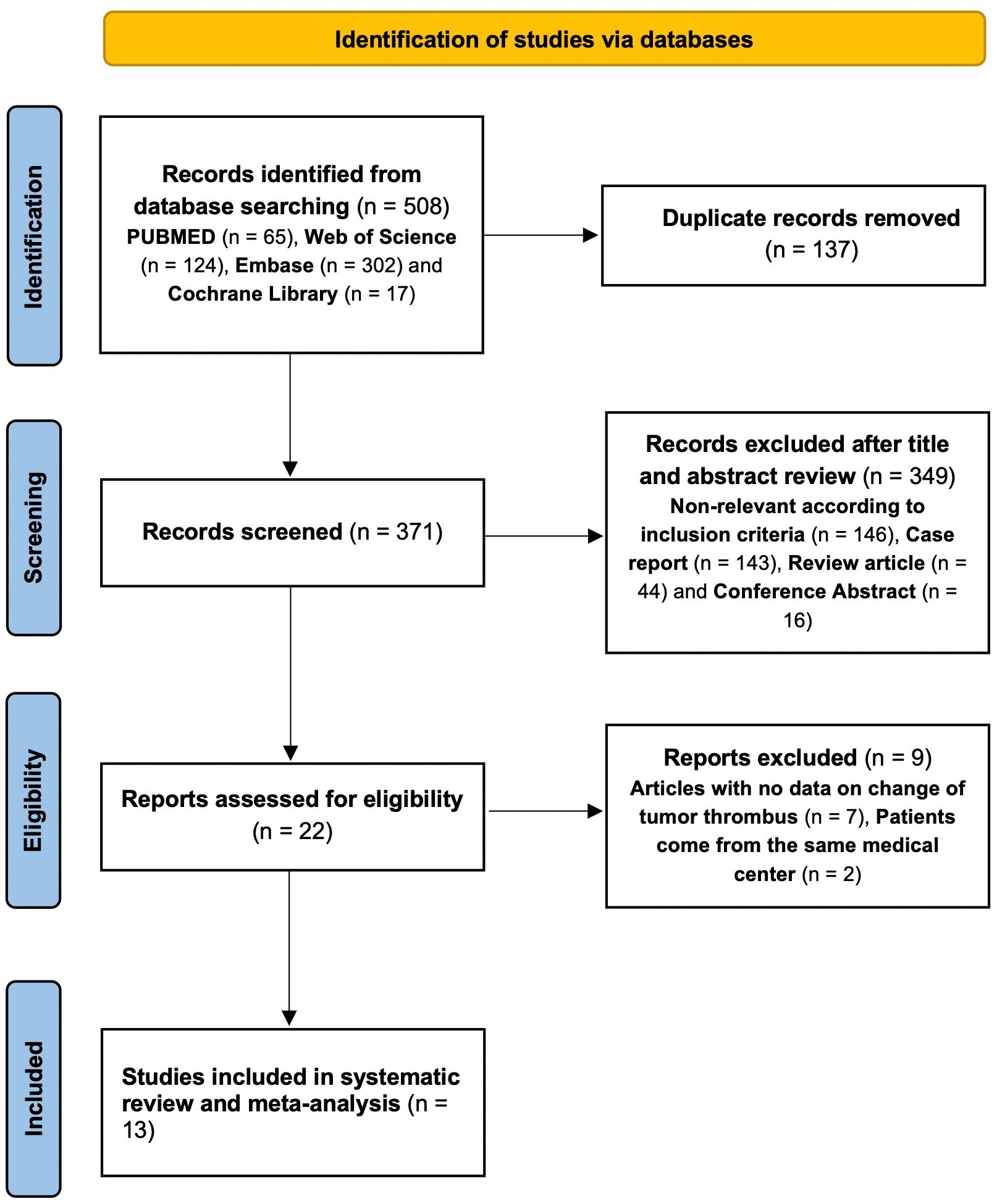 Flow chart of the selection of publications included in the meta- analysis. The process includes: records identified from database searching (n=508), duplicates removed (n=137), resulting in records screened (n=371). After title and abstract review, records excluded (n=349) for non-relevance, case reports, review articles, and conference abstracts. Reports assessed for eligibility (n=22), with further exclusions (n=9) for specific criteria, resulting in 13 studies included in systematic review and meta-analysis.