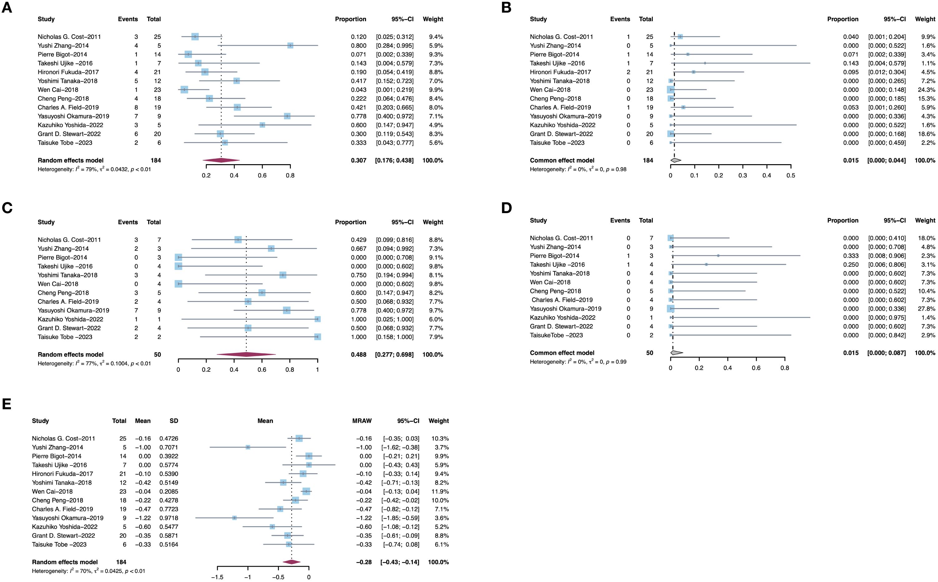 Thirteen studies provided data of TT levels in RCC patients after receiving PMT. Among 184 patients, 30.7% (95% CI, 17.6–43.8%, I2 = 79%, p<0.01, Figure 2A) patients experienced a decrease in TT levels after receiving PMT, while only 1.5% (95% CI, 0–0.044%, I2 = 0%, p=0.98, Figure 2B) exhibited an increase in TT levels. Additionally, we specifically analyzed patients with Mayo 3/4 TT. Among these patients, 48.8% (95% CI, 27.7%–69.8%, I2 = 77%, p<0.01, Figure 2C) experienced a decrease in TT level, while only 1.5% (95% CI, 0–8.7%, I2 = 0%, p=0.99, Figure 2D) exhibited an increase. Further analysis of the changes in TT levels in the above studies showed that the average TT level decreased by 0.28 grade (95% CI, 0–0.044%, I2 = 0%, p=0.98) (Figure 2E). Sensitivity analysis of reduced tumor thrombus levels is shown in Figure 3 and other sensitivity analysis about TT level changes were shown in Supplementary Figure 1.
