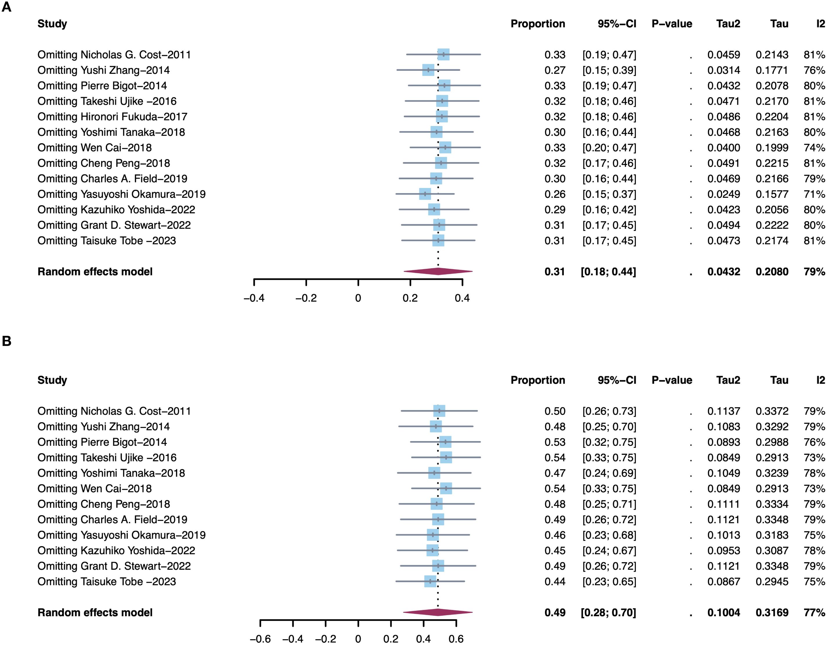 Forest plots titled A and B display studies with corresponding proportions, confidence intervals, P-values, Tau2, Tau, and I2 values. Each plot includes a list of omitted studies with years, showing differing effects on the results. Both feature random effects models, indicated by diamonds at the bottom, showing pooled estimates with confidence intervals. Plot A indicates a proportion of 0.31 with a confidence interval of [0.18; 0.44] and plot B shows 0.49 [0.28; 0.70].