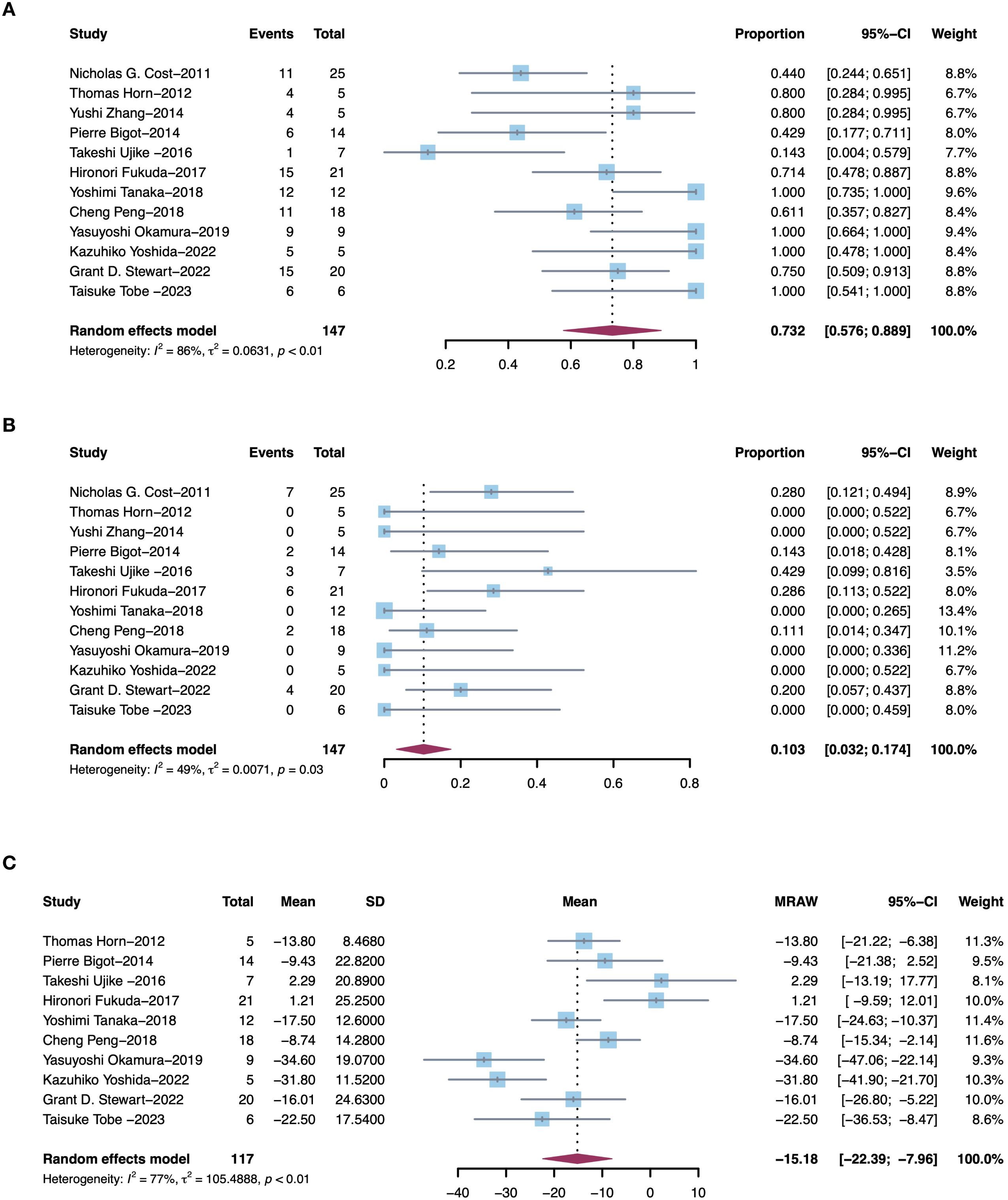 Figure 4. Pooled estimates of efficacies of presurgical molecular therapy on thrombus height for renal cell carcinoma with tumor thrombus. (A) Decrease in thrombus height. (B) Increase in thrombus height. (C) Average thrombus height changes.
