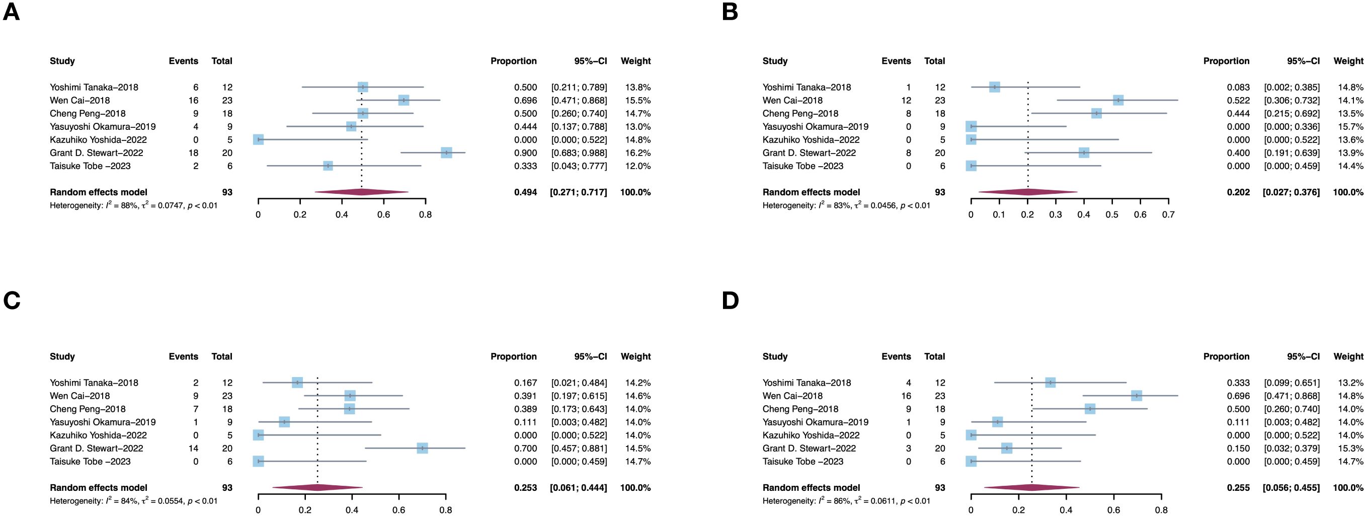 Figure 5. Pooled estimates of adverse effects of presurgical molecular therapy on for renal cell carcinoma with tumor thrombus. (A) hypertension. (B) diarrhea. (C) fatigue. (D) hand-foot syndrome.