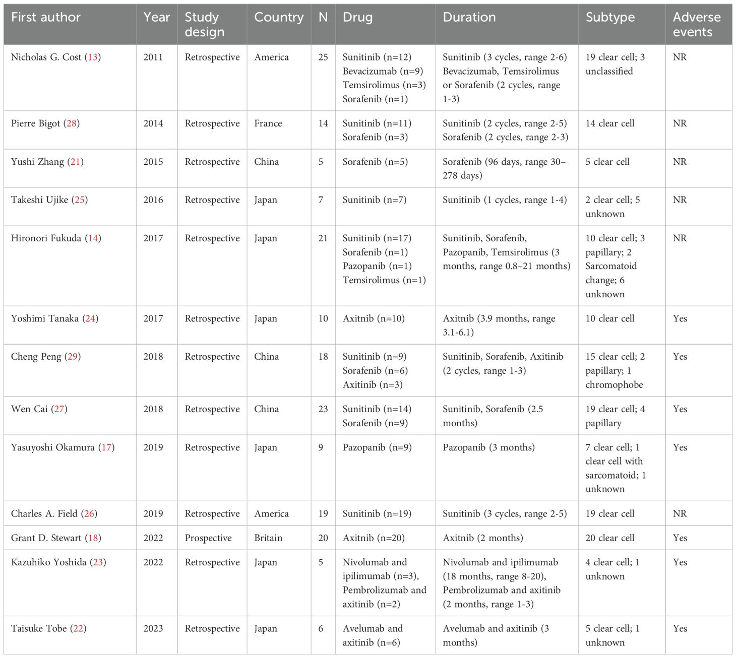 The initial search yielded 508 relevant references in PubMed (n=65), Web of science (n=124), Embase (n=302) and the Cochrane Library (n=17). After removing duplicate studies and conducting thorough screenings of titles, abstracts, and full-texts, 13 studies were ultimately included in our analysis. These comprised 1 prospective study (18) and 12 retrospective studies (13, 14, 17, 2129), involving a total of 184 patients. Detailed study characteristics are presented in Table 1. Among the 13 studies, 11 focused on targeted therapy and 2 investigated a combination of targeted therapy and immunotherapy. The study selection process is shown in Figure 1.