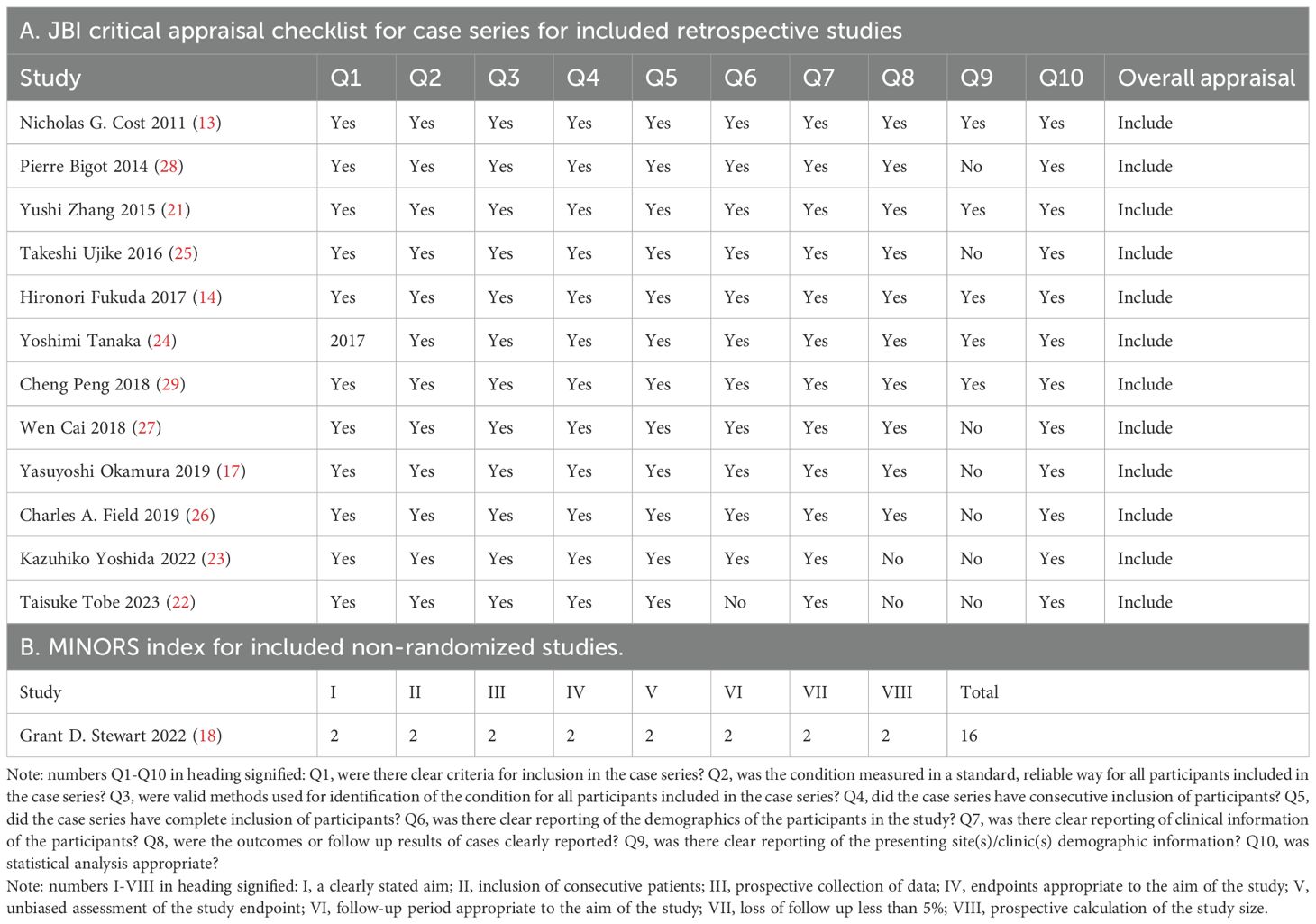 The quality of the included prospective studies was assessed using the Methodological Evaluation Metrics for Non-Randomized Controlled Trials (MINORS) (19). Twelve assessment indications make up MINORS, and each one has a score range of 0 to 2. 0 indicates that there is no data reported. 1 indicates that there is data reported, but not enough details. 2 indicates that there is enough information in the data report. The retrospective studies without comparison group were assessed by JBI Critical Appraisal Checklist for Case Series (20).