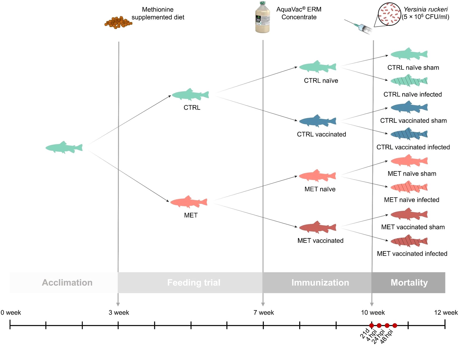 In this context, methionine emerges as a promising candidate to enhance vaccine efficacy, given its documented role in promoting both neutrophil and macrophage trafficking and proliferation, which may in turn enhance antigen uptake and presentation to lymphocytes. Therefore, it is hypothesized that methionine could act similarly to adjuvants classified as signal 1 facilitators by improving the immune-availability of vaccine antigens required for the activation of specific T and B lymphocytes (30). However, to the best of our knowledge, no studies have directly evaluated the effect of dietary methionine supplementation on vaccine efficacy in fish. Therefore, the present study aimed to investigate the immunomodulatory effects of dietary methionine supplementation in rainbow trout, focusing on its impact on the immune response and vaccine efficacy against the worldwide economically important pathogen Yersinia ruckeri, the causative agent of enteric redmouth disease (ERM) (31).